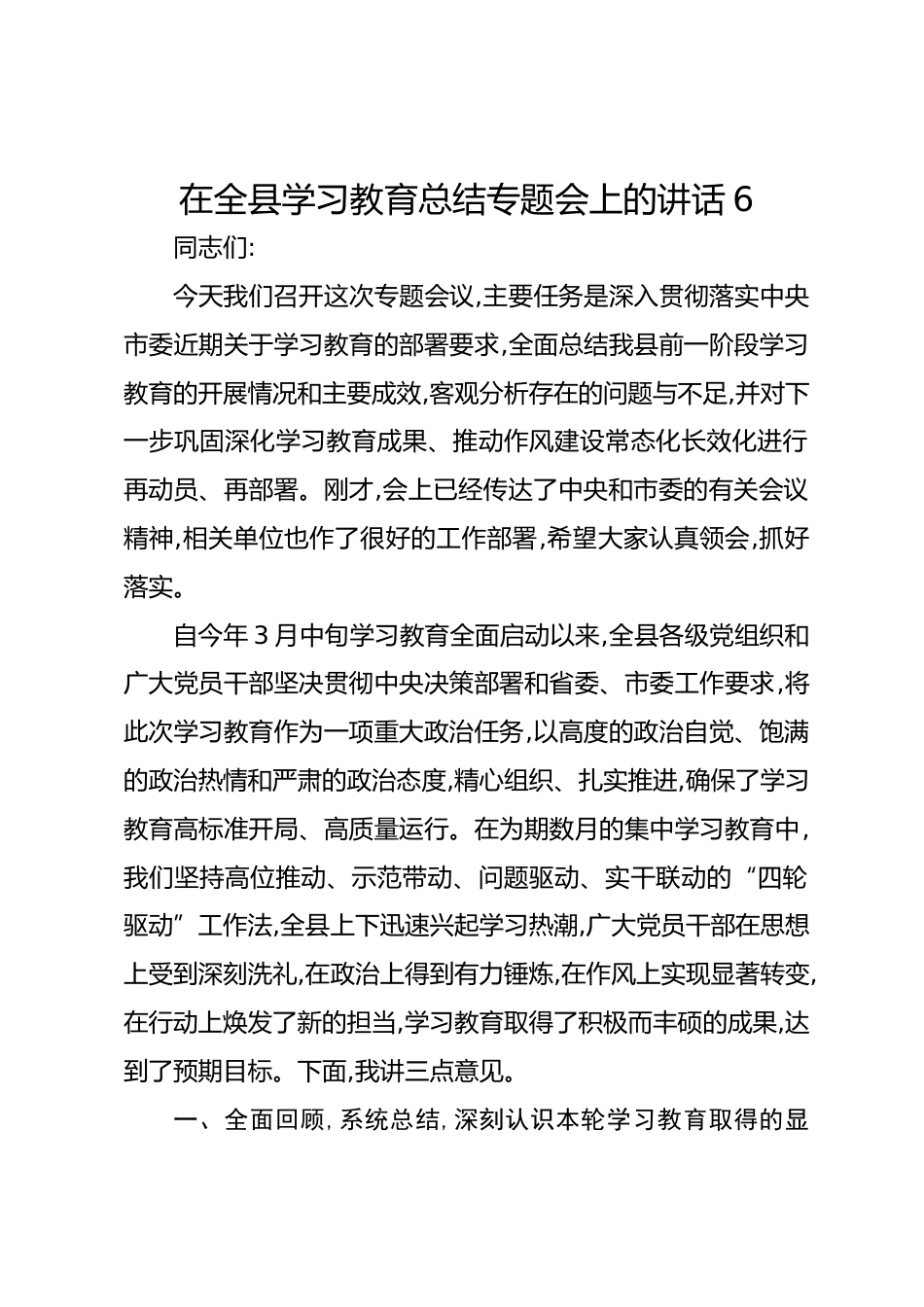 在全縣學(xué)習(xí)教育總結(jié)專(zhuān)題會(huì)上的講話(huà)6