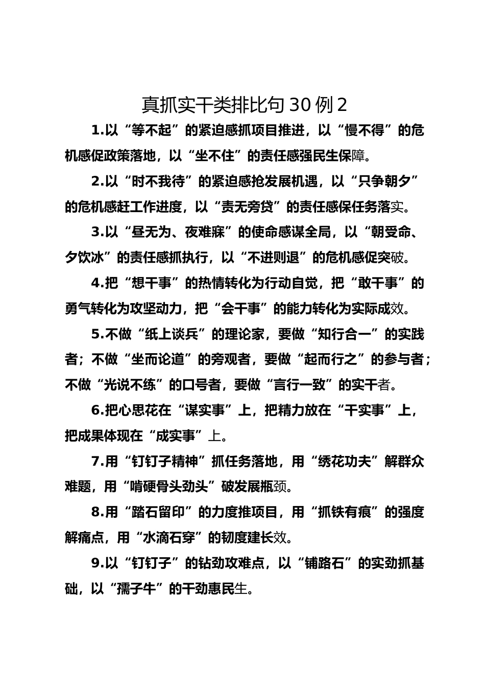 真抓實(shí)干類排比句30例21.以“等不起”的緊迫感抓項(xiàng)目推進(jìn),以“慢不得”的危機(jī)感促政策落地,以“坐不住”的責(zé)任感強(qiáng)民生保障。2.以“時(shí)不我待”的緊迫感搶發(fā)展機(jī)遇,以“只爭(zhēng)朝夕”的危機(jī)感趕工作進(jìn)度,以“責(zé)無旁貸”的責(zé)任感保任務(wù)落實(shí)。3.以“晝無為、夜難寐”的使命感謀全局,以“朝受命、夕飲冰”的責(zé)任感抓執(zhí)行,以“不進(jìn)則退”的危機(jī)感促突破。4.把“想干事”的熱情轉(zhuǎn)化為行動(dòng)自覺,把“敢干事”的勇氣轉(zhuǎn)化為攻堅(jiān)動(dòng)力,把“會(huì)干事”的能力轉(zhuǎn)化為實(shí)際成效。5.不做“紙上談兵”的理論家,要做“知行合一”的實(shí)踐者;不做“坐而論道”的旁觀者,要做“起而行之”的...