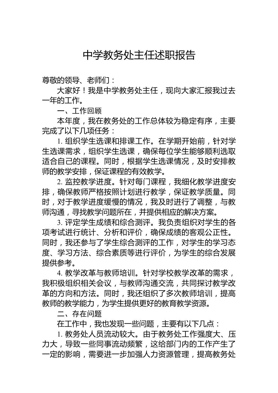 中學(xué)教務(wù)處主任述職報(bào)告尊敬的領(lǐng)導(dǎo)、老師們:大家好!我是中學(xué)教務(wù)處主任,現(xiàn)向大家匯報(bào)我過去一年的工作。一、工作回顧本年度,我在教務(wù)處的工作總體較為穩(wěn)定有序,主要完成了以下幾項(xiàng)任務(wù):1.組織學(xué)生選課和排課工作。在學(xué)期開始前,針對(duì)學(xué)生選課需求,組織學(xué)生選課,確保每位學(xué)生能夠順利選取適合自己的課程。同時(shí),根據(jù)學(xué)生選課情況,及時(shí)安排教師的教學(xué)安排,保證課程的有效教學(xué)。2.監(jiān)控教學(xué)進(jìn)度。針對(duì)每門課程,我細(xì)化教學(xué)進(jìn)度安排,確保教師嚴(yán)格按照計(jì)劃進(jìn)行教學(xué),保證教學(xué)質(zhì)量。同時(shí),對(duì)于教學(xué)進(jìn)度緩慢的情況,我及時(shí)進(jìn)行了調(diào)整,與教師溝通,尋找教學(xué)問題所在,...