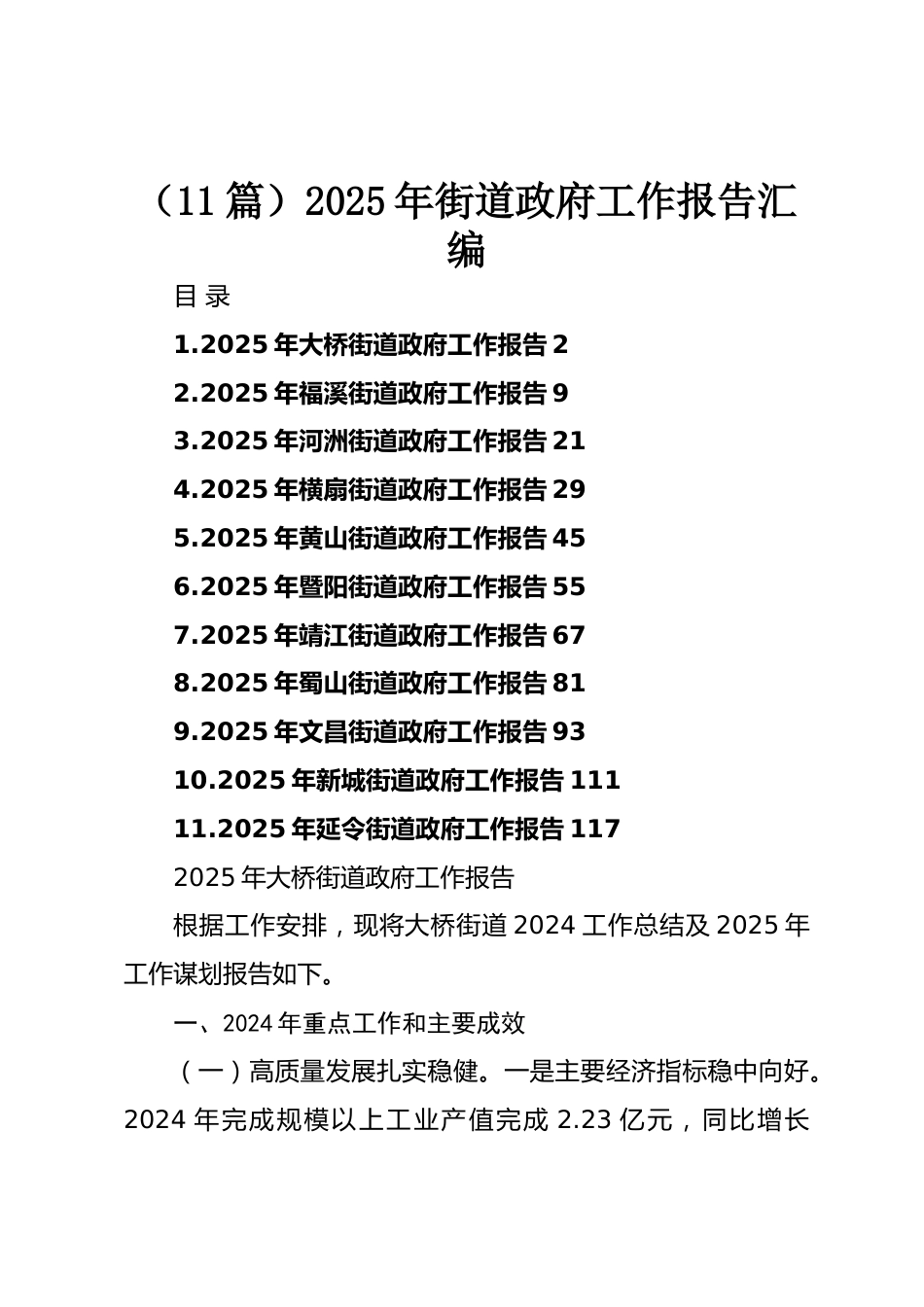 (11篇)2025年街道政府工作報(bào)告匯編目錄1.2025年大橋街道政府工作報(bào)告22.2025年福溪街道政府工作報(bào)告93.2025年河洲街道政府工作報(bào)告214.2025年橫扇街道政府工作報(bào)告295.2025年黃山街道政府工作報(bào)告456.2025年暨陽(yáng)街道政府工作報(bào)告557.2025年靖江街道政府工作報(bào)告678.2025年蜀山街道政府工作報(bào)告819.2025年文昌街道政府工作報(bào)告9310.2025年新城街道政府工作報(bào)告11111.2025年延令街道政府工作報(bào)告1172025年大橋街道政府工作報(bào)告根據(jù)工作安排,現(xiàn)將大橋街道2024工作總結(jié)及2025年工作謀劃報(bào)告如下。一、2024年重點(diǎn)工作和主要成效(一)高質(zhì)量發(fā)展扎實(shí)穩(wěn)健。一是主要經(jīng)濟(jì)指標(biāo)...