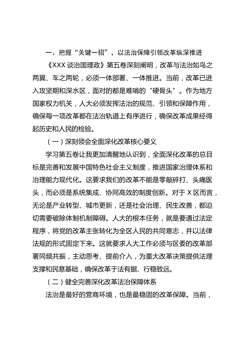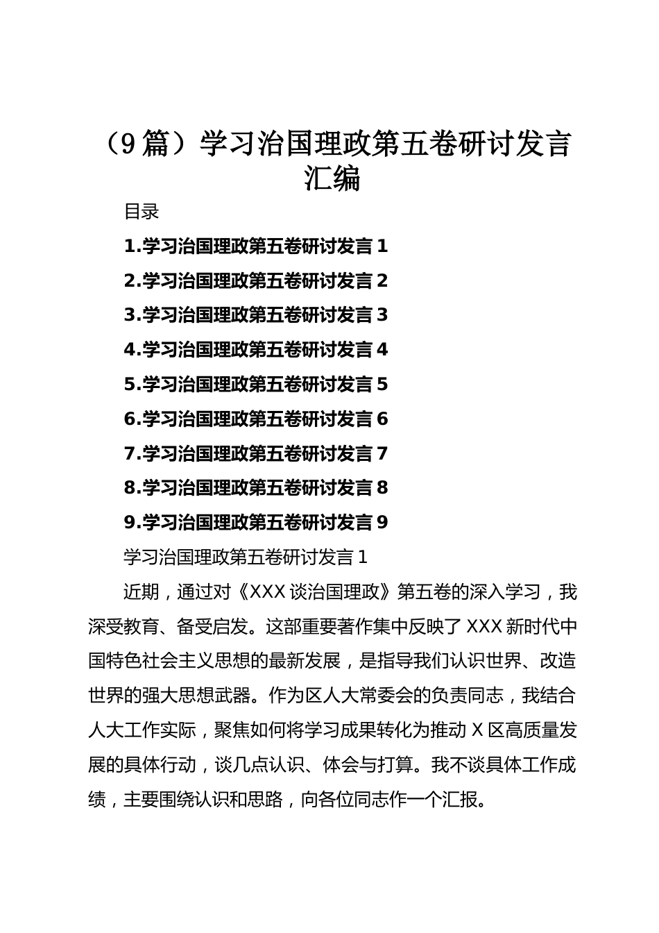 (9篇)學(xué)習(xí)治國理政第五卷研討發(fā)言匯編目錄1.學(xué)習(xí)治國理政第五卷研討發(fā)言12.學(xué)習(xí)治國理政第五卷研討發(fā)言23.學(xué)習(xí)治國理政第五卷研討發(fā)言34.學(xué)習(xí)治國理政第五卷研討發(fā)言45.學(xué)習(xí)治國理政第五卷研討發(fā)言56.學(xué)習(xí)治國理政第五卷研討發(fā)言67.學(xué)習(xí)治國理政第五卷研討發(fā)言78.學(xué)習(xí)治國理政第五卷研討發(fā)言89.學(xué)習(xí)治國理政第五卷研討發(fā)言9學(xué)習(xí)治國理政第五卷研討發(fā)言1近期,通過對《XXX談治國理政》第五卷的深入學(xué)習(xí),我深受教育、備受啟發(fā)。這部重要著作集中反映了XXX新時代中國特色社會主義思想的最新發(fā)展,是指導(dǎo)我們認識世界、改造世界的強大思想武器。作為區(qū)人大常委會的負責(zé)同...