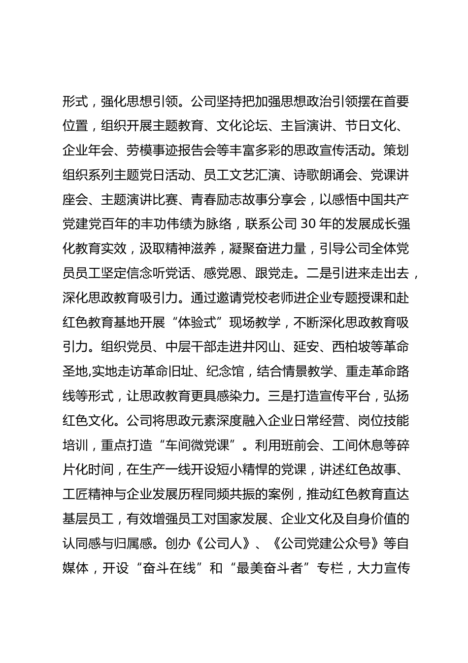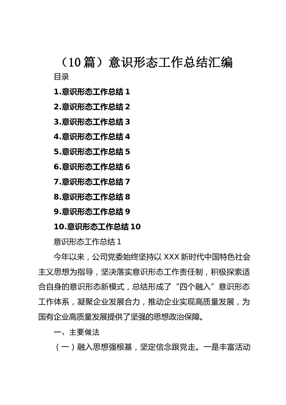 (10篇)意識(shí)形態(tài)工作總結(jié)匯編目錄1.意識(shí)形態(tài)工作總結(jié)12.意識(shí)形態(tài)工作總結(jié)23.意識(shí)形態(tài)工作總結(jié)34.意識(shí)形態(tài)工作總結(jié)45.意識(shí)形態(tài)工作總結(jié)56.意識(shí)形態(tài)工作總結(jié)67.意識(shí)形態(tài)工作總結(jié)78.意識(shí)形態(tài)工作總結(jié)89.意識(shí)形態(tài)工作總結(jié)910.意識(shí)形態(tài)工作總結(jié)10意識(shí)形態(tài)工作總結(jié)1今年以來,公司黨委始終堅(jiān)持以XXX新時(shí)代中國特色社會(huì)主義思想為指導(dǎo),堅(jiān)決落實(shí)意識(shí)形態(tài)工作責(zé)任制,積極探索適合自身的意識(shí)形態(tài)新模式,總結(jié)形成了“四個(gè)融入”意識(shí)形態(tài)工作體系,凝聚企業(yè)發(fā)展合力,推動(dòng)企業(yè)實(shí)現(xiàn)高質(zhì)量發(fā)展,為國有企業(yè)高質(zhì)量發(fā)展提供了堅(jiān)強(qiáng)的思想政治保障。一、主要做法(一)融入思想強(qiáng)根基,...