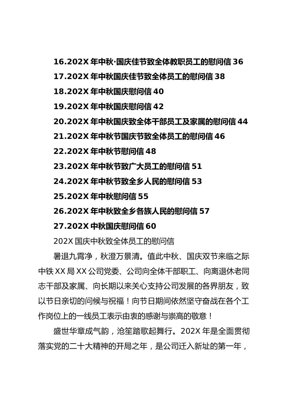 (27篇)202X年中秋國慶慰問信匯編目錄1.202X國慶中秋致全體員工的慰問信32.202X年國慶節(jié)、中秋節(jié)慰問信53.202X年國慶節(jié)致全體員工及家屬的慰問信74.202X年國慶慰問信95.202X年國慶中秋“雙節(jié)”的慰問信116.202X年國慶中秋“雙節(jié)”的慰問信137.202X年致局系統(tǒng)干部職工“中秋節(jié)、國慶節(jié)”慰問信158.202X年中共XX縣公安局委員會中秋節(jié)慰問信179.202X年中秋、國慶“兩節(jié)”慰問信2010.202X年中秋、國慶“雙節(jié)”慰問信2211.202X年中秋、國慶“雙節(jié)”致公司全體員工的慰問信2412.202X年中秋、國慶“雙節(jié)”致全場干部職工的慰問信2613.202X年中秋、國慶“雙節(jié)”致全體員工的慰問...