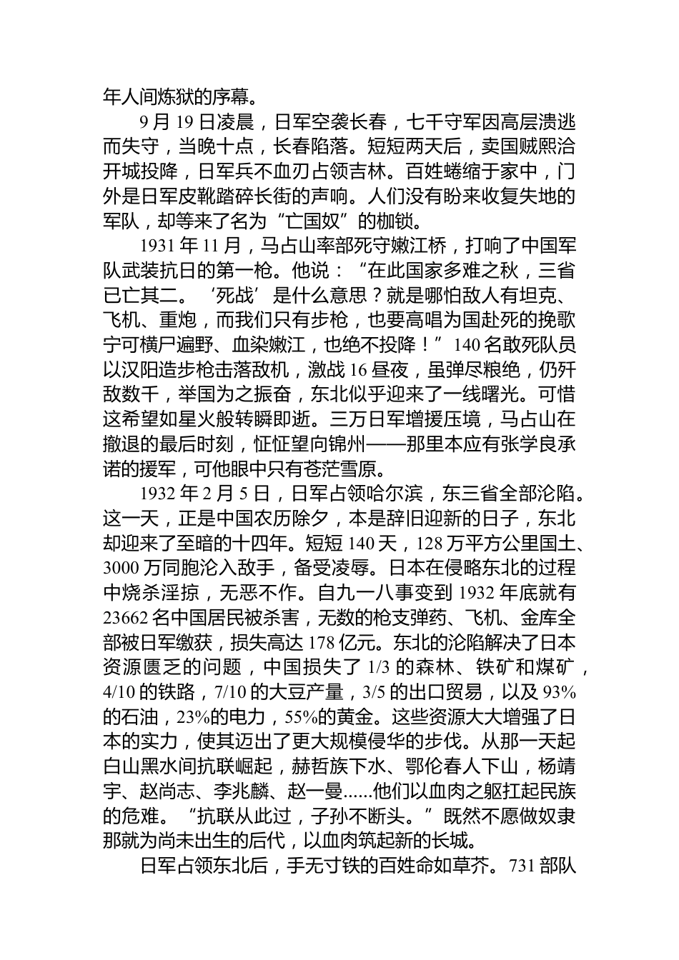 紀(jì)念抗戰(zhàn)勝利80周年主題黨課講稿同志們:整整80年了,1945年8月15日,這一刻永遠(yuǎn)定格在歷史中,值得每一位中華兒女銘記。日本的投降,是中國人民歷經(jīng)十四年浴血奮戰(zhàn)的結(jié)果,是正義戰(zhàn)勝邪惡的偉大勝利。八十年后的中國,山河無恙、國泰民安、繁榮昌盛,但我們絕不能忘記,今天的和平是無數(shù)先烈用鮮血和生命換來的。我們銘記歷史,不是為了延續(xù)仇恨,而是要從歷史中汲取教訓(xùn),防止悲劇重演,從抗戰(zhàn)的勝利中汲取前進(jìn)的力量,傳承并弘揚(yáng)偉大的抗戰(zhàn)精神。正如那句鏗鏘的話語:“天下興亡,匹夫有責(zé)?!?500萬軍民傷亡,是一個(gè)怎樣沉重的數(shù)字?它意味著,如今活著的中國人中,...