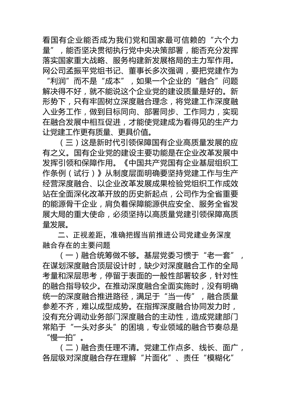 專題黨課:堅持黨建業(yè)務(wù)深度融合,以高質(zhì)量黨建引領(lǐng)保障國有企業(yè)高質(zhì)量發(fā)展XXX總書記指出,堅持黨的領(lǐng)導(dǎo)、加強黨的建設(shè),是我國國有企業(yè)的“根”和“魂”,是我國國有企業(yè)的獨特優(yōu)勢。只有圍繞中心、建設(shè)隊伍、服務(wù)群眾,推動黨建和業(yè)務(wù)深度融合,黨建工作才能找準(zhǔn)定位。國有企業(yè)是中國特色社會主義經(jīng)濟(jì)的重要物質(zhì)基礎(chǔ)和政治基礎(chǔ),是我們黨執(zhí)政興國的重要支柱和依靠力量。推動國有企業(yè)黨建工作與生產(chǎn)經(jīng)營深度融合,是新時代國有企業(yè)黨建工作的生命力之所在、意義重大,必須以高質(zhì)量黨建引領(lǐng)保障企業(yè)高質(zhì)量發(fā)展。一、提高站位,深刻認(rèn)識推動國有企業(yè)黨建業(yè)務(wù)深度融合的重...