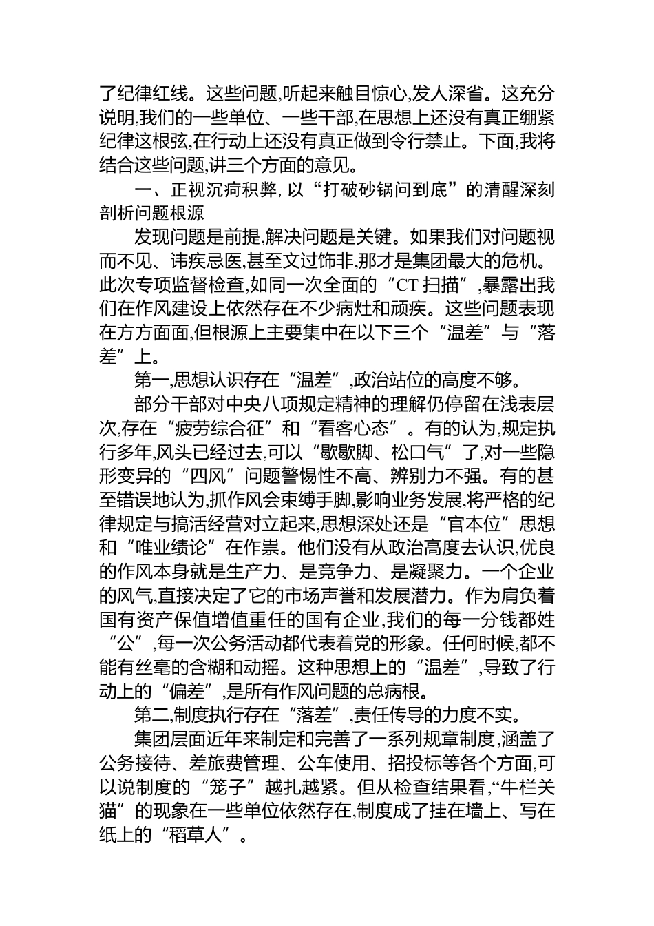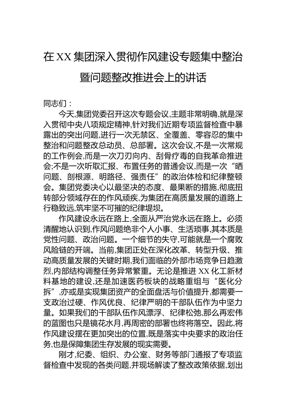 在XX集團(tuán)深入貫徹作風(fēng)建設(shè)專題集中整治暨問題整改推進(jìn)會(huì)上的講話同志們:今天,集團(tuán)黨委召開這次專題會(huì)議,主題非常明確,就是深入貫徹中央八項(xiàng)規(guī)定精神,針對(duì)我們近期專項(xiàng)監(jiān)督檢查中暴露出的突出問題,進(jìn)行一次無禁區(qū)、全覆蓋、零容忍的集中整治和問題整改總動(dòng)員、總部署。這次會(huì)議,不是一次常規(guī)的工作例會(huì),而是一次刀刃向內(nèi)、刮骨療毒的自我革命推進(jìn)會(huì);不是一次聽取匯報(bào)、布置任務(wù)的普通會(huì)議,而是一次“曬問題、剖根源、明路徑、強(qiáng)責(zé)任”的政治體檢和紀(jì)律整頓會(huì)。集團(tuán)黨委決心以最堅(jiān)決的態(tài)度、最果斷的措施,徹底扭轉(zhuǎn)部分領(lǐng)域存在的作風(fēng)頑疾,為集團(tuán)在高質(zhì)量發(fā)展的道路上行穩(wěn)...