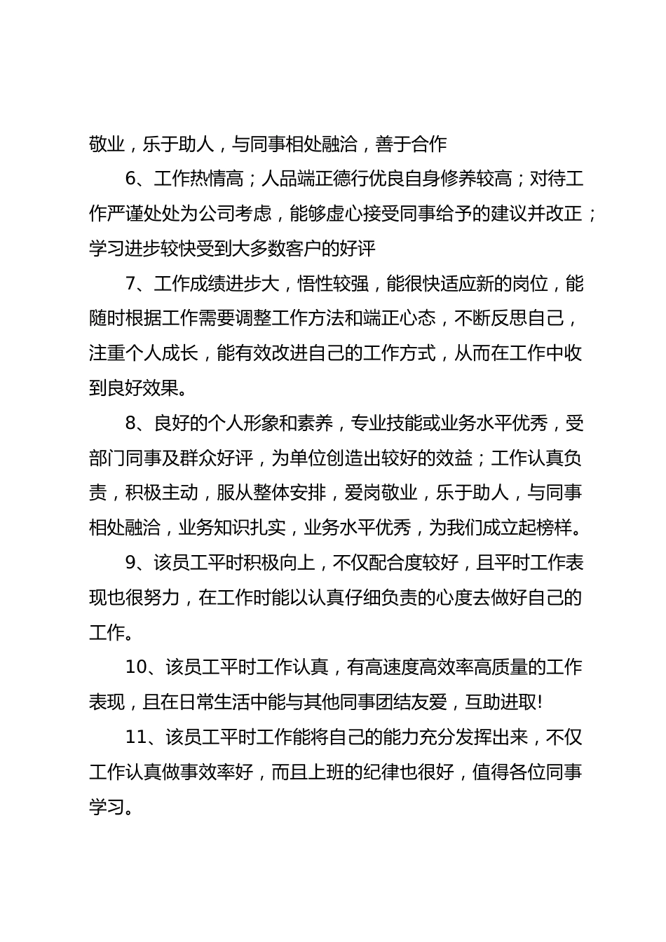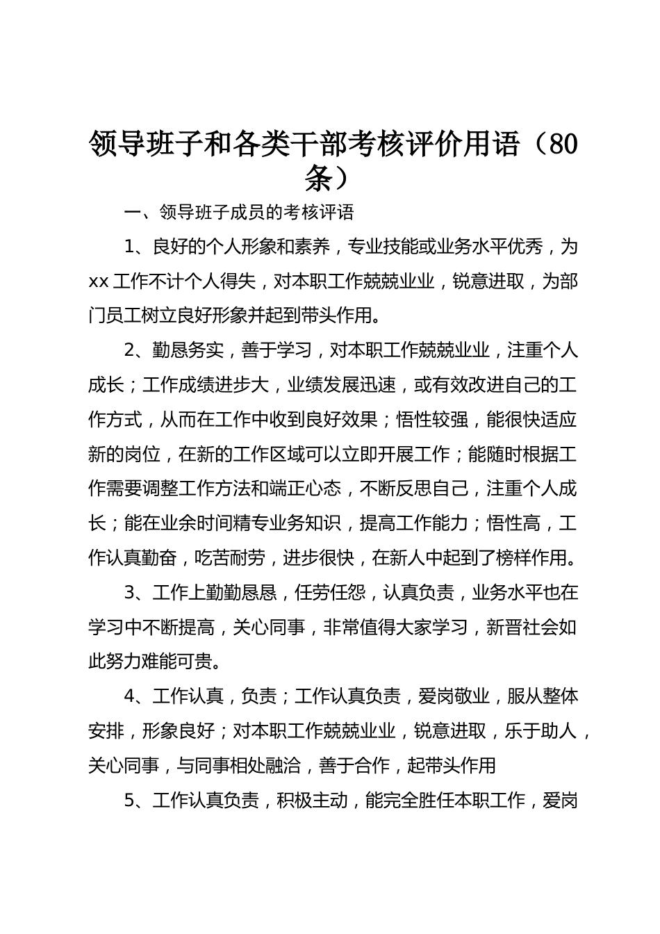 領導班子和各類干部考核評價用語(80條)一、領導班子成員的考核評語1、良好的個人形象和素養(yǎng),專業(yè)技能或業(yè)務水平優(yōu)秀,為xx工作不計個人得失,對本職工作兢兢業(yè)業(yè),銳意進取,為部門員工樹立良好形象并起到帶頭作用。2、勤懇務實,善于學習,對本職工作兢兢業(yè)業(yè),注重個人成長;工作成績進步大,業(yè)績發(fā)展迅速,或有效改進自己的工作方式,從而在工作中收到良好效果;悟性較強,能很快適應新的崗位,在新的工作區(qū)域可以立即開展工作;能隨時根據(jù)工作需要調整工作方法和端正心態(tài),不斷反思自己,注重個人成長;能在業(yè)余時間精專業(yè)務知識,提高工作能力;悟性高,工作認真...