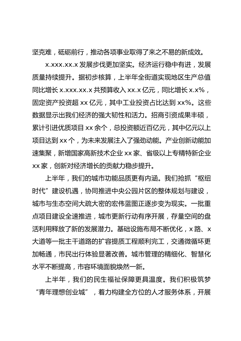 (2篇)在xx街道二級干部(擴(kuò)大)會議暨下半年工作推進(jìn)會上的講話在xx街道二級干部(擴(kuò)大)會議暨下半年工作推進(jìn)會上的講話同志們:今天,我們在這里召開街道二級干部(擴(kuò)大)會議暨下半年工作推進(jìn)會,主要任務(wù)是深入學(xué)習(xí)貫徹黨的二十大和二十屆二中、三中全會精神,以及XXX總書記對x省、x市工作的重要講話精神,全面落實(shí)省、市、區(qū)委的各項(xiàng)決策部署。會議旨在系統(tǒng)回顧上半年工作,科學(xué)部署下半年任務(wù),動員街道上下進(jìn)一步統(tǒng)一思想、凝聚共識、堅(jiān)定信心、扎實(shí)奮斗,確保圓滿完成全年經(jīng)濟(jì)社會發(fā)展目標(biāo),為“十四五”規(guī)劃勝利收官、“十五五”科學(xué)謀篇奠定堅(jiān)實(shí)基礎(chǔ),切實(shí)展...