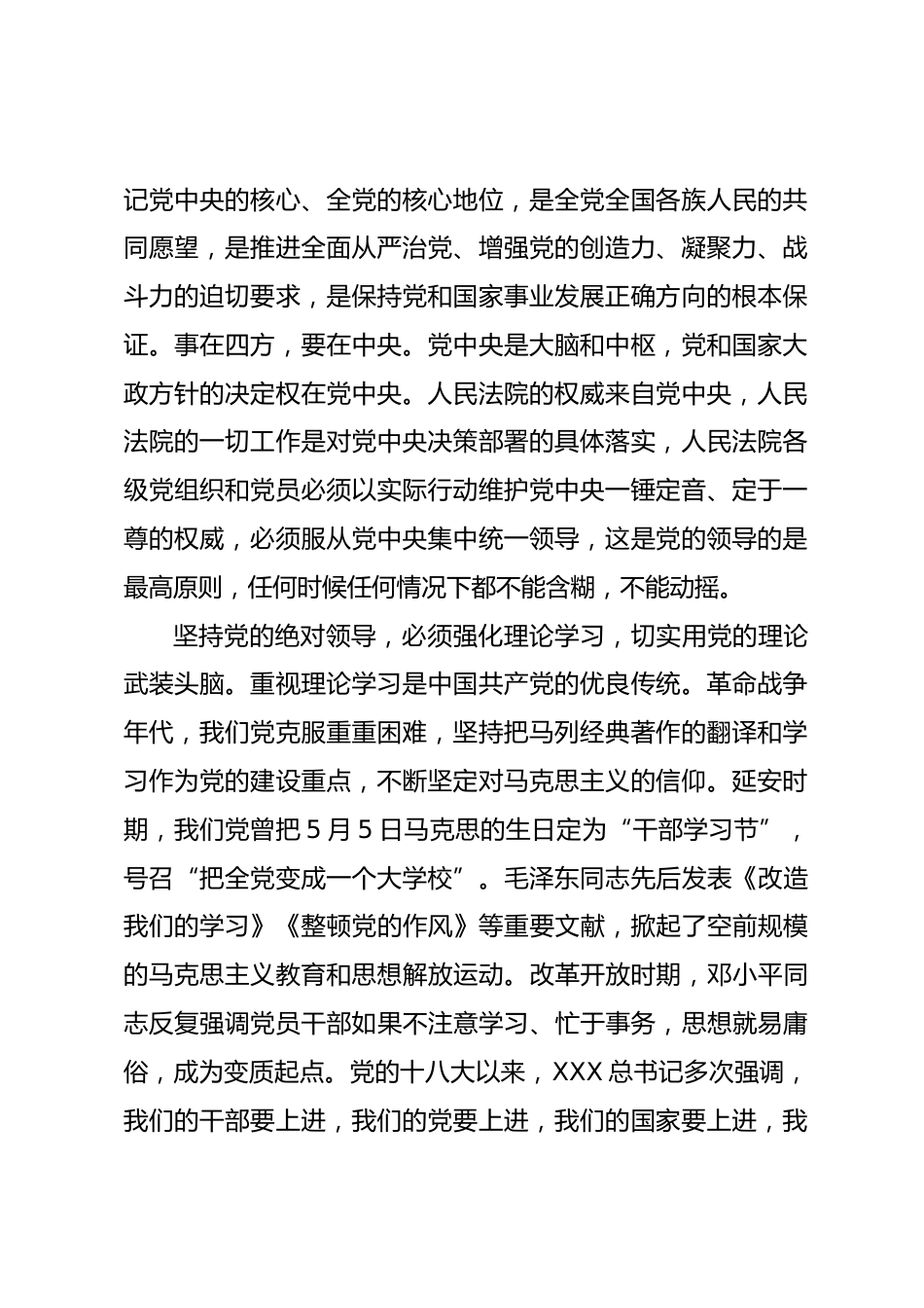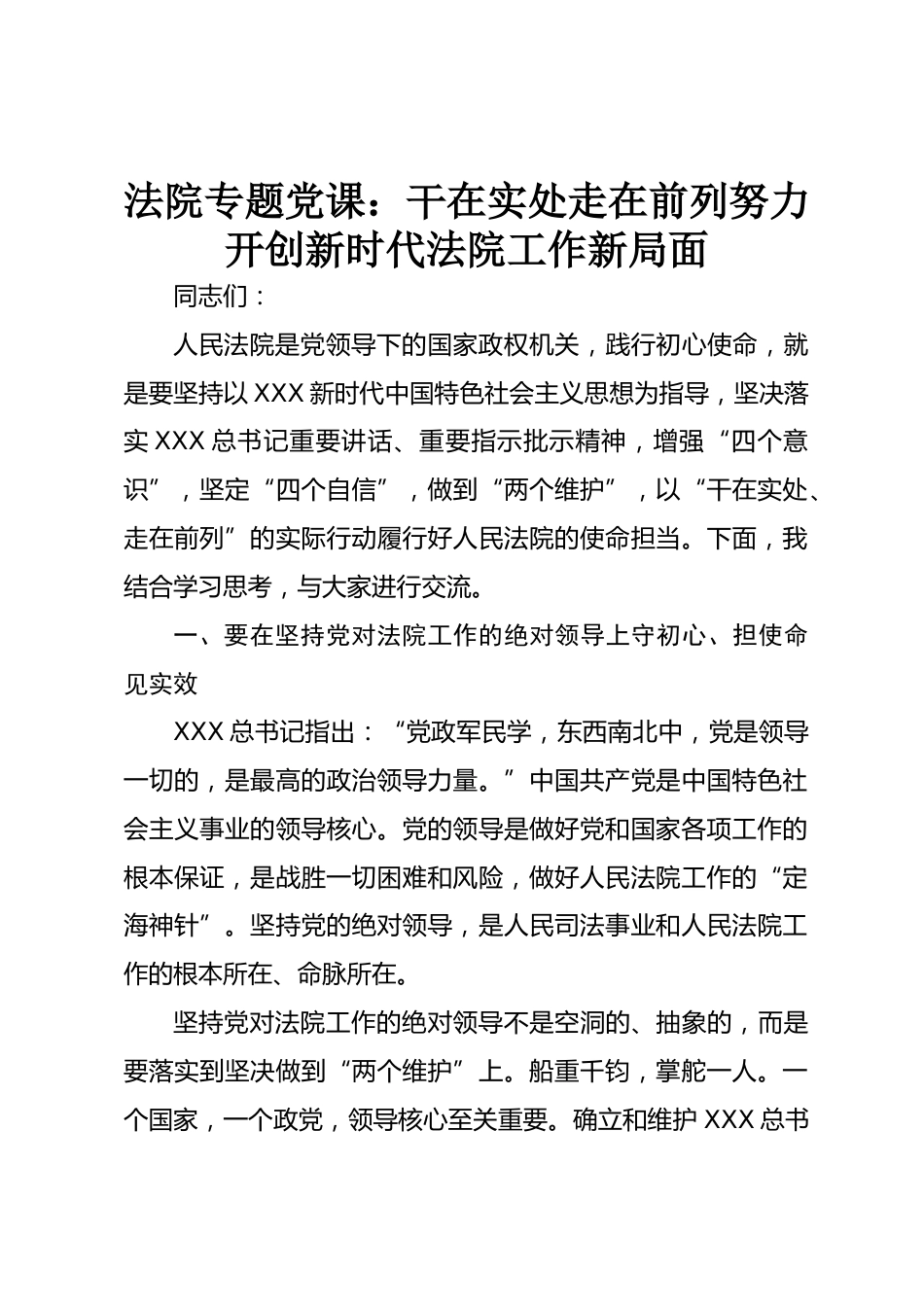 法院專題黨課:干在實(shí)處走在前列努力開(kāi)創(chuàng)新時(shí)代法院工作新局面同志們:人民法院是黨領(lǐng)導(dǎo)下的國(guó)家政權(quán)機(jī)關(guān),踐行初心使命,就是要堅(jiān)持以XXX新時(shí)代中國(guó)特色社會(huì)主義思想為指導(dǎo),堅(jiān)決落實(shí)XXX總書記重要講話、重要指示批示精神,增強(qiáng)“四個(gè)意識(shí)”,堅(jiān)定“四個(gè)自信”,做到“兩個(gè)維護(hù)”,以“干在實(shí)處、走在前列”的實(shí)際行動(dòng)履行好人民法院的使命擔(dān)當(dāng)。下面,我結(jié)合學(xué)習(xí)思考,與大家進(jìn)行交流。一、要在堅(jiān)持黨對(duì)法院工作的絕對(duì)領(lǐng)導(dǎo)上守初心、擔(dān)使命見(jiàn)實(shí)效XXX總書記指出:“黨政軍民學(xué),東西南北中,黨是領(lǐng)導(dǎo)一切的,是最高的政治領(lǐng)導(dǎo)力量?!敝袊?guó)共產(chǎn)黨是中國(guó)特色社會(huì)主義事業(yè)...