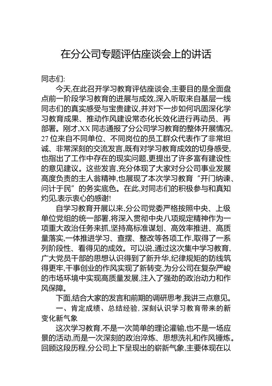 在分公司專題評(píng)估座談會(huì)上的講話同志們:今天,在此召開學(xué)習(xí)教育評(píng)估座談會(huì),主要目的是全面盤點(diǎn)前一階段學(xué)習(xí)教育的進(jìn)展與成效,深入聽取來自基層一線同志們的真實(shí)感受與寶貴建議,并對(duì)下一步如何鞏固深化學(xué)習(xí)教育成果、推動(dòng)作風(fēng)建設(shè)常態(tài)化長效化進(jìn)行再動(dòng)員、再部署。剛才,XX同志通報(bào)了分公司學(xué)習(xí)教育的整體開展情況,27位來自不同單位、不同崗位的員工群眾代表作了非常坦誠、非常深刻的交流發(fā)言,既有對(duì)學(xué)習(xí)教育成效的切身感受,也指出了工作中存在的現(xiàn)實(shí)問題,更提出了許多富有建設(shè)性的意見建議。這些發(fā)言,充分體現(xiàn)了大家對(duì)分公司事業(yè)發(fā)展高度負(fù)責(zé)的主人翁精神,也展現(xiàn)了本次學(xué)習(xí)...