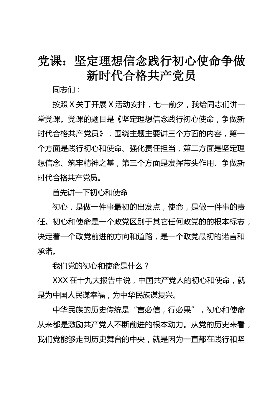 黨課:堅定理想信念踐行初心使命爭做新時代合格共產(chǎn)黨員同志們:按照X關(guān)于開展X活動安排,七一前夕,我給同志們講一堂黨課。黨課的題目是《堅定理想信念踐行初心使命,爭做新時代合格共產(chǎn)黨員》,圍繞主題主要講三個方面的內(nèi)容,第一個方面是踐行初心和使命、強化責(zé)任擔(dān)當(dāng),第二方面是堅定理想信念、筑牢精神之基,第三個方面是發(fā)揮帶頭作用、爭做新時代合格共產(chǎn)黨員。首先講一下初心和使命初心,是做一件事最初的出發(fā)點,使命,是做一件事的責(zé)任。初心和使命是一個政黨區(qū)別于其它任何政黨的的根本標(biāo)志,決定著一個政黨前進(jìn)的方向和道路,是一個政黨最初的諾言和承諾。我...