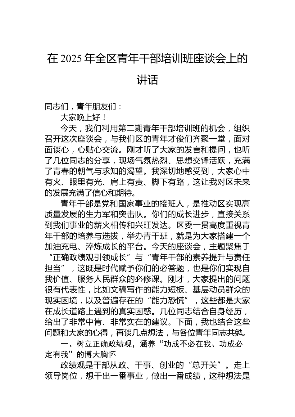 在2025年全區(qū)青年干部培訓(xùn)班座談會(huì)上的講話同志們,青年朋友們:大家晚上好!今天,我們利用第二期青年干部培訓(xùn)班的機(jī)會(huì),組織召開(kāi)這次座談會(huì),與我們區(qū)的青年才俊們齊聚一堂,面對(duì)面談心,心貼心交流。剛才聽(tīng)了大家的發(fā)言和提問(wèn),也聽(tīng)了幾位同志的分享,現(xiàn)場(chǎng)氣氛熱烈、思想交鋒活躍,充滿了青春的朝氣與求知的渴望。我深切地感受到,大家心中有火、眼里有光、肩上有責(zé)、腳下有路,這讓我對(duì)區(qū)未來(lái)的發(fā)展充滿了信心和期待。青年干部是黨和國(guó)家事業(yè)的接班人,是推動(dòng)區(qū)實(shí)現(xiàn)高質(zhì)量發(fā)展的生力軍和突擊隊(duì)。你們的成長(zhǎng)進(jìn)步,直接關(guān)系到我們事業(yè)的薪火相傳和興旺發(fā)達(dá)。區(qū)委一貫高...