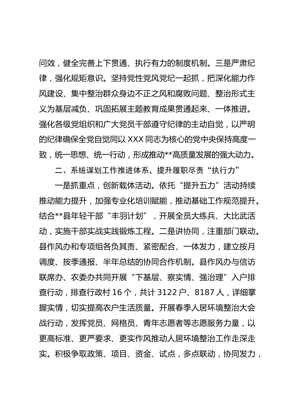 (5篇)能力作風建設典型案例匯編能力作風建設典型案例1**縣精準對標省市關于深化能力作風建設“抓基層、打基礎、強落實、見實效”活動工作要求部署,錘煉“扎扎實實、踏踏實實、求真務實”優(yōu)良作風,牢牢把握其深刻內(nèi)涵,進一步將“實”的要求體現(xiàn)到干事創(chuàng)業(yè)上。一、嚴密夯實領導責任體系,發(fā)揮以上率下“引領力”一是凝心聚力,筑牢思想根基。扎實開展理論學習,組織縣委理論學習中心組開展集體學習研討2次,帶動全縣各級理論學習中心組開展學習120余次,成立青年理論學習小組83個,組內(nèi)人數(shù)756人。開展黨建知識測試,各鄉(xiāng)鎮(zhèn)、縣直各部門960余人參加。全縣開展“崗位大...