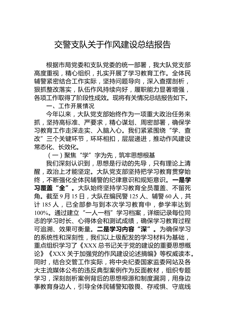 交警支隊關于作風建設總結報告根據(jù)市局黨委和支隊黨委的統(tǒng)一部署,我大隊黨支部高度重視,精心組織,扎實開展了學習教育工作。全體民輔警緊密結合工作實際,堅持問題導向,深入查擺剖析,狠抓整改落實,隊伍作風持續(xù)向好,履職能力顯著增強,各項工作取得了階段性成效?,F(xiàn)將有關情況總結報告如下。一、工作開展情況今年以來,大隊黨支部始終作為一項重大政治任務來抓,堅持高標準、嚴要求,精心謀劃、周密部署,確保學習教育工作走深走實、入腦入心。我們緊緊圍繞“學、查改”三個關鍵環(huán)節(jié),環(huán)環(huán)相扣,層層遞進,推動作風建設常態(tài)化、長效化。(一)聚焦“學”字為先,筑...