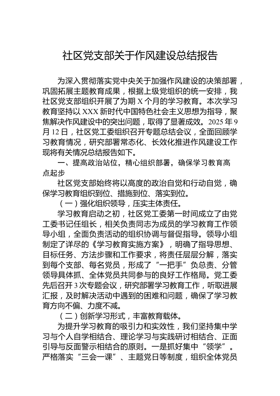 社區(qū)黨支部關于作風建設總結報告為深入貫徹落實黨中央關于加強作風建設的決策部署,鞏固拓展主題教育成果,根據(jù)上級黨組織的統(tǒng)一安排,我社區(qū)黨支部組織開展了為期X個月的學習教育。本次學習教育堅持以XXX新時代中國特色社會主義思想為指導,聚焦解決作風建設中的突出問題,取得了顯著成效。2025年9月12日,社區(qū)黨工委組織召開專題總結會議,全面回顧學習教育情況,研究部署常態(tài)化、長效化推進作風建設工作現(xiàn)將有關情況總結報告如下。一、提高政治站位,精心組織部署,確保學習教育高點起步社區(qū)黨支部始終將以高度的政治自覺和行動自覺,確保學習教育組織到位、措施到位...