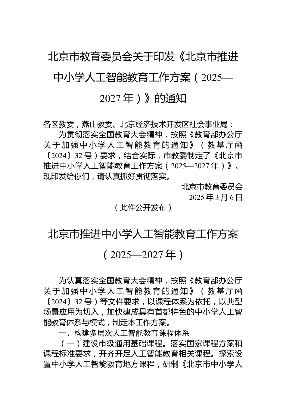 北京市教育委員會關(guān)于印發(fā)《北京市推進中小學(xué)人工智能教育工作方案(2025—2027年)》的通知各區(qū)教委,燕山教委、北京經(jīng)濟技術(shù)開發(fā)區(qū)社會事業(yè)局:為貫徹落實全國教育大會精神,按照《教育部辦公廳關(guān)于加強中小學(xué)人工智能教育的通知》(教基廳函〔2024〕32號)要求,結(jié)合實際,市教委制定了《北京市推進中小學(xué)人工智能教育工作方案(2025—2027年)》?,F(xiàn)印發(fā)給你們,請認(rèn)真抓好貫徹落實。北京市教育委員會2025年3月6日(此件公開發(fā)布)北京市推進中小學(xué)人工智能教育工作方案(2025—2027年)為認(rèn)真落實全國教育大會精神,按照《教育部辦公廳關(guān)于加強中小學(xué)人工智能教育的...