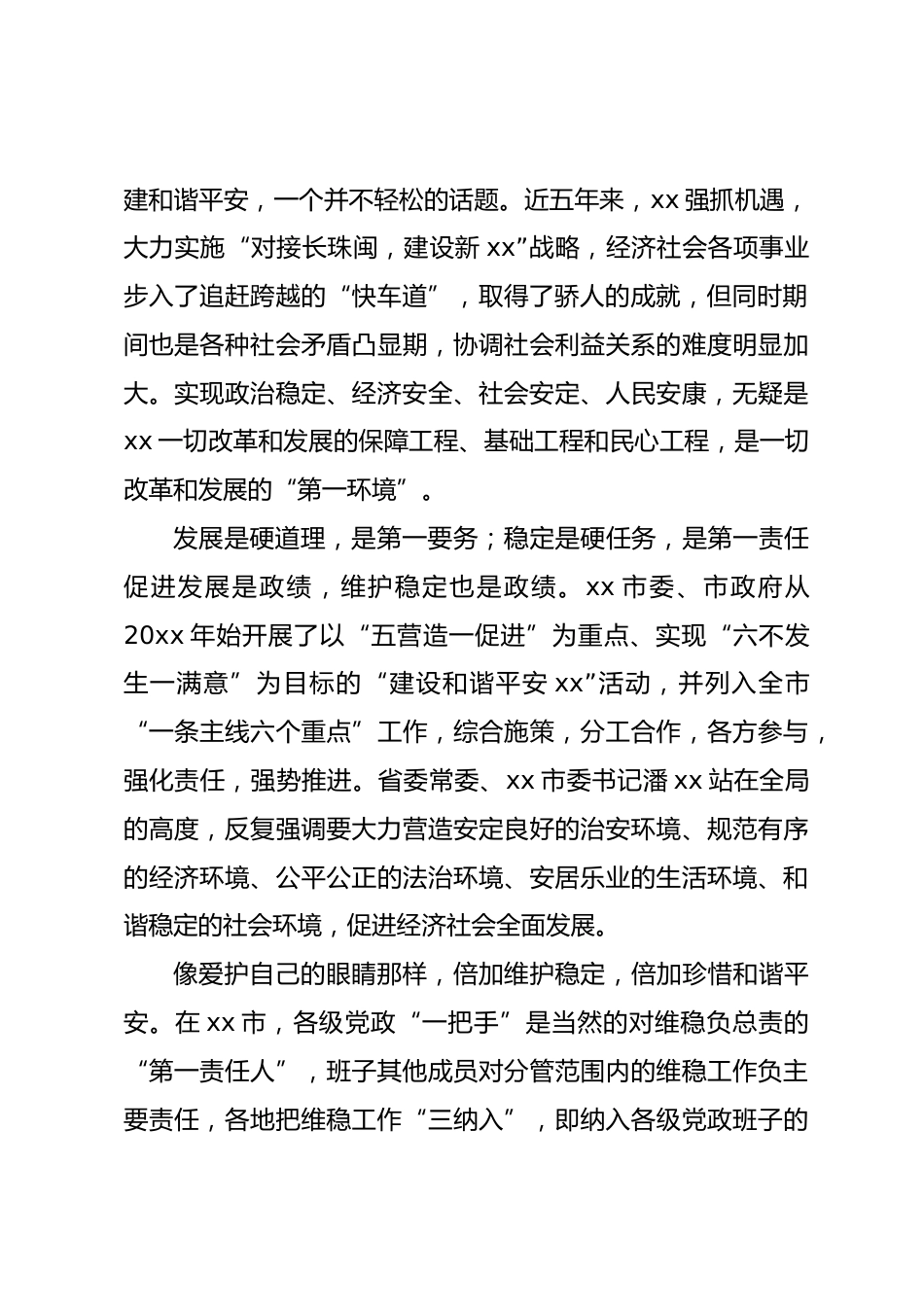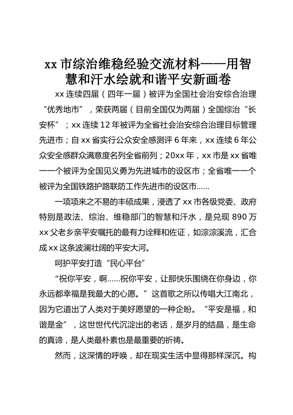 xx市綜治維穩(wěn)經(jīng)驗交流材料——用智慧和汗水繪就和諧平安新畫卷xx連續(xù)四屆(四年一屆)被評為全國社會治安綜合治理“優(yōu)秀地市”,榮獲兩屆(目前全國僅為兩屆)全國綜治“長安杯”;xx連續(xù)12年被評為全省社會治安綜合治理目標(biāo)管理先進(jìn)市;自xx省實行公眾安全感測評6年來,xx連續(xù)6年公眾安全感群眾滿意度名列全省前列;20xx年,xx市是xx省唯一一個被評為全國見義勇為先進(jìn)城市的設(shè)區(qū)市;全省唯一一個被評為全國鐵路護路聯(lián)防工作先進(jìn)市的設(shè)區(qū)市……一項項來之不易的豐碩成果,浸透了xx市各級黨委、政府特別是政法、綜治、維穩(wěn)部門的智慧和汗水,是兌現(xiàn)890萬xx父老鄉(xiāng)親平安囑...