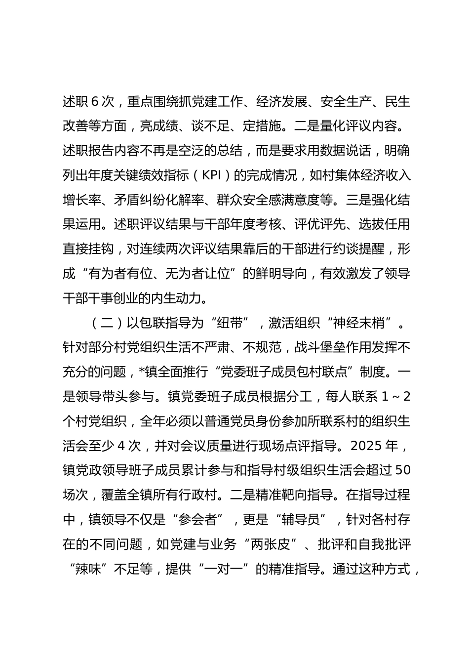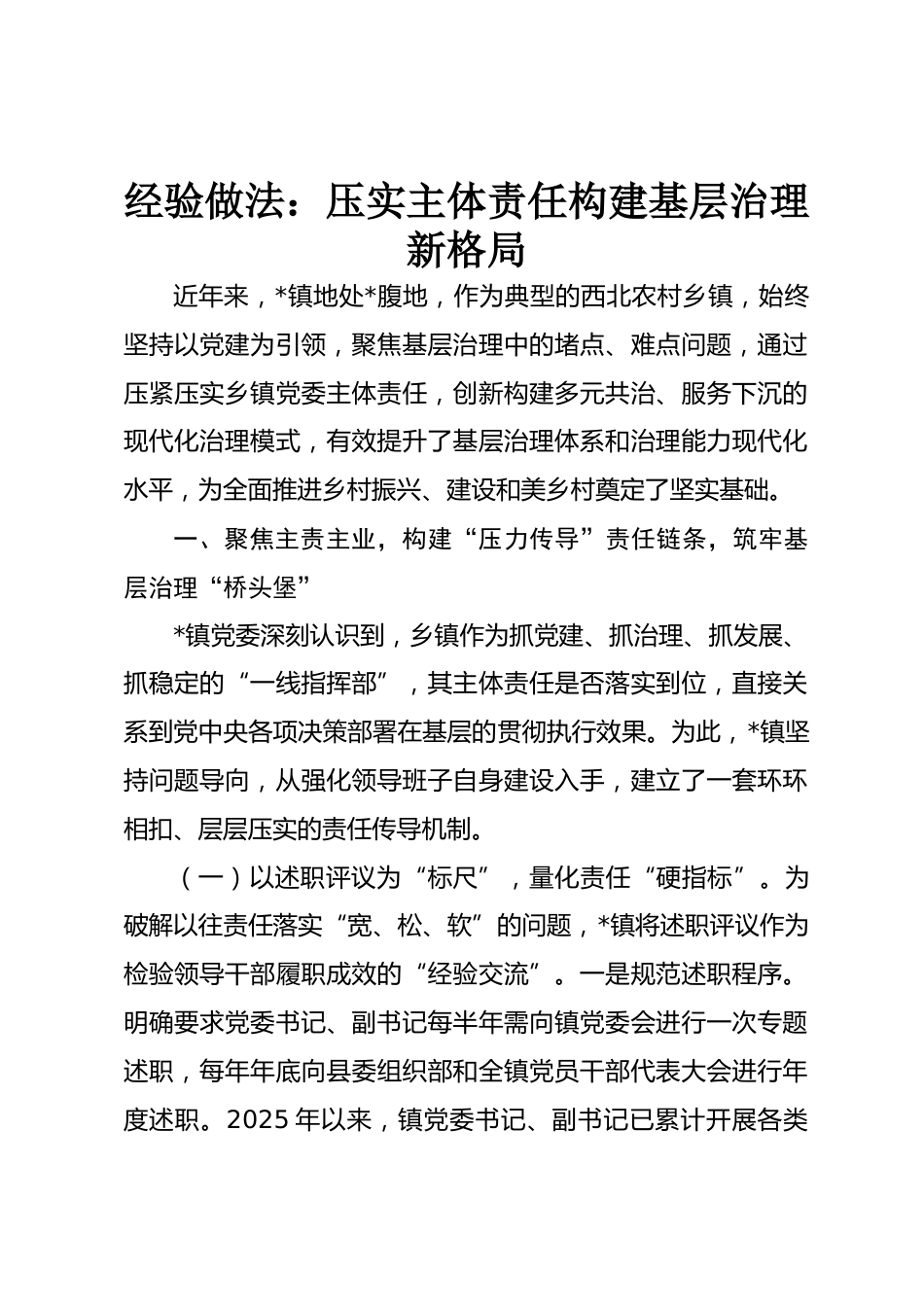 經(jīng)驗做法:壓實主體責(zé)任構(gòu)建基層治理新格局近年來,*鎮(zhèn)地處*腹地,作為典型的西北農(nóng)村鄉(xiāng)鎮(zhèn),始終堅持以黨建為引領(lǐng),聚焦基層治理中的堵點、難點問題,通過壓緊壓實鄉(xiāng)鎮(zhèn)黨委主體責(zé)任,創(chuàng)新構(gòu)建多元共治、服務(wù)下沉的現(xiàn)代化治理模式,有效提升了基層治理體系和治理能力現(xiàn)代化水平,為全面推進鄉(xiāng)村振興、建設(shè)和美鄉(xiāng)村奠定了堅實基礎(chǔ)。一、聚焦主責(zé)主業(yè),構(gòu)建“壓力傳導(dǎo)”責(zé)任鏈條,筑牢基層治理“橋頭堡”*鎮(zhèn)黨委深刻認識到,鄉(xiāng)鎮(zhèn)作為抓黨建、抓治理、抓發(fā)展、抓穩(wěn)定的“一線指揮部”,其主體責(zé)任是否落實到位,直接關(guān)系到黨中央各項決策部署在基層的貫徹執(zhí)行效果。為此,*鎮(zhèn)...