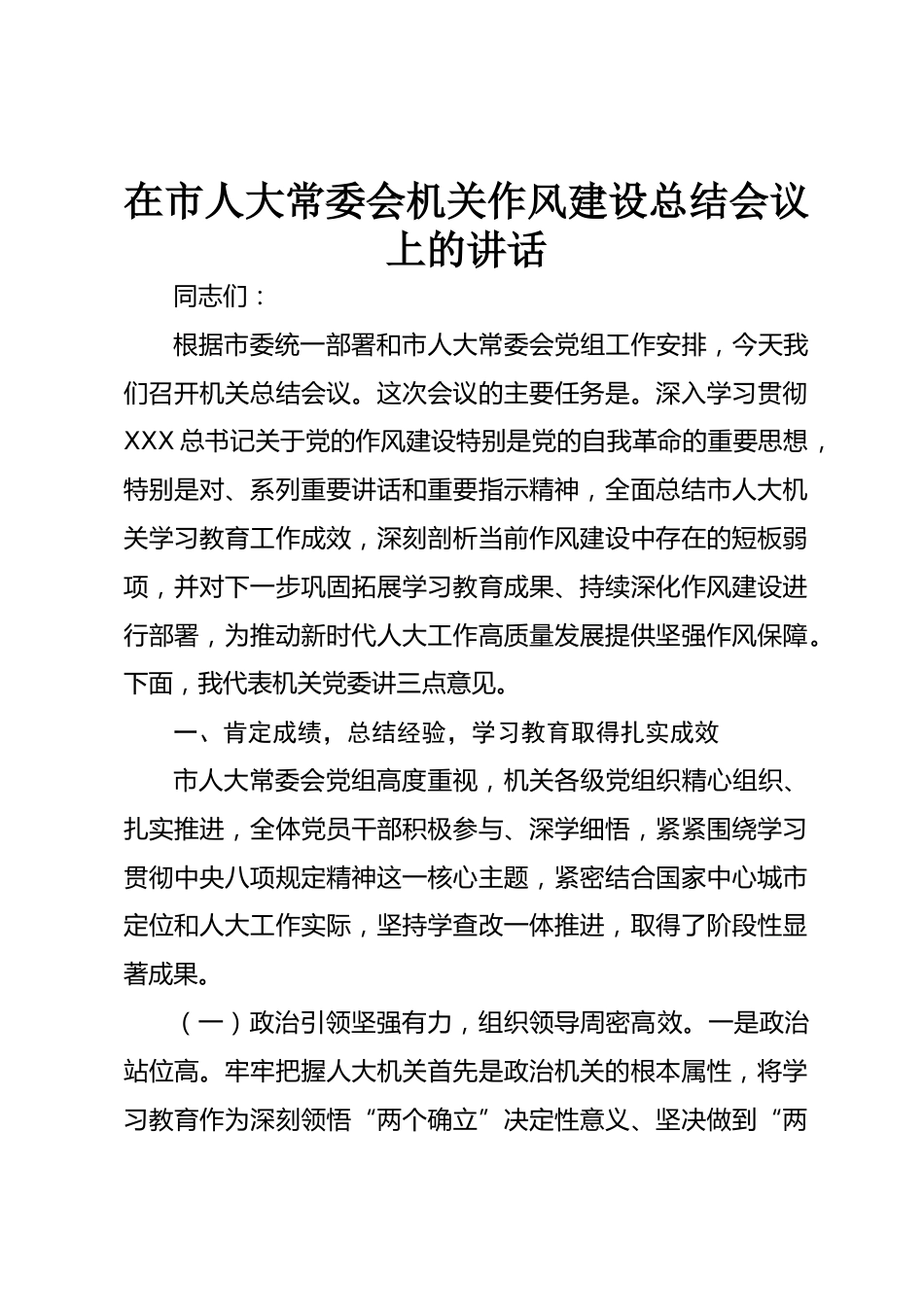 在市人大常委會(huì)機(jī)關(guān)作風(fēng)建設(shè)總結(jié)會(huì)議上的講話同志們:根據(jù)市委統(tǒng)一部署和市人大常委會(huì)黨組工作安排,今天我們召開機(jī)關(guān)總結(jié)會(huì)議。這次會(huì)議的主要任務(wù)是。深入學(xué)習(xí)貫徹XXX總書記關(guān)于黨的作風(fēng)建設(shè)特別是黨的自我革命的重要思想,特別是對(duì)、系列重要講話和重要指示精神,全面總結(jié)市人大機(jī)關(guān)學(xué)習(xí)教育工作成效,深刻剖析當(dāng)前作風(fēng)建設(shè)中存在的短板弱項(xiàng),并對(duì)下一步鞏固拓展學(xué)習(xí)教育成果、持續(xù)深化作風(fēng)建設(shè)進(jìn)行部署,為推動(dòng)新時(shí)代人大工作高質(zhì)量發(fā)展提供堅(jiān)強(qiáng)作風(fēng)保障。下面,我代表機(jī)關(guān)黨委講三點(diǎn)意見。一、肯定成績(jī),總結(jié)經(jīng)驗(yàn),學(xué)習(xí)教育取得扎實(shí)成效市人大常委會(huì)黨組高度重視,...
