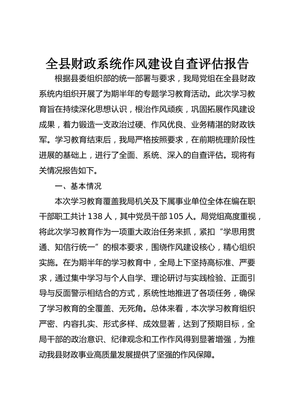 全縣財政系統(tǒng)作風建設自查評估報告根據(jù)縣委組織部的統(tǒng)一部署與要求,我局黨組在全縣財政系統(tǒng)內(nèi)組織開展了為期半年的專題學習教育活動。此次學習教育旨在持續(xù)深化思想認識,根治作風頑疾,鞏固拓展作風建設成果,著力鍛造一支政治過硬、作風優(yōu)良、業(yè)務精湛的財政鐵軍。學習教育結束后,我局嚴格按照要求,在前期梳理階段性進展的基礎上,進行了全面、系統(tǒng)、深入的自查評估。現(xiàn)將有關情況報告如下。一、基本情況本次學習教育覆蓋我局機關及下屬事業(yè)單位全體在編在職干部職工共計138人,其中黨員干部105人。局黨組高度重視,將此次學習教育作為一項重大政治任務來抓,緊扣“...
