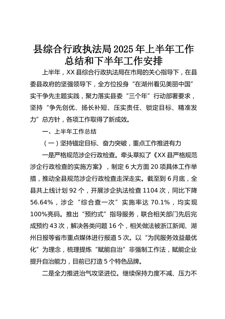 縣綜合行政執(zhí)法局2025年上半年工作總結(jié)和下半年工作安排上半年,XX縣綜合行政執(zhí)法局在市局的關(guān)心指導(dǎo)下,在縣委縣政府的堅(jiān)強(qiáng)領(lǐng)導(dǎo)下,全方位投身“在湖州看見美麗中國”實(shí)干爭先主題實(shí)踐,聚力落實(shí)縣委“三個(gè)年”行動(dòng)部署要求,堅(jiān)持“爭先創(chuàng)優(yōu)、揚(yáng)長補(bǔ)短、壓實(shí)責(zé)任、鎖定目標(biāo)、精準(zhǔn)發(fā)力”總方針,各項(xiàng)工作取得了新成效。一、上半年工作總結(jié)(一)堅(jiān)持錨定目標(biāo)、奮力突破,重點(diǎn)工作推進(jìn)有力一是嚴(yán)格規(guī)范涉企行政檢查。牽頭草擬了《XX縣嚴(yán)格規(guī)范涉企行政檢查的實(shí)施方案》,制定6大方面20項(xiàng)具體工作舉措,推動(dòng)全縣規(guī)范涉企行政檢查走深走實(shí)。截至到6月底,全縣共上線計(jì)劃92個(gè)...