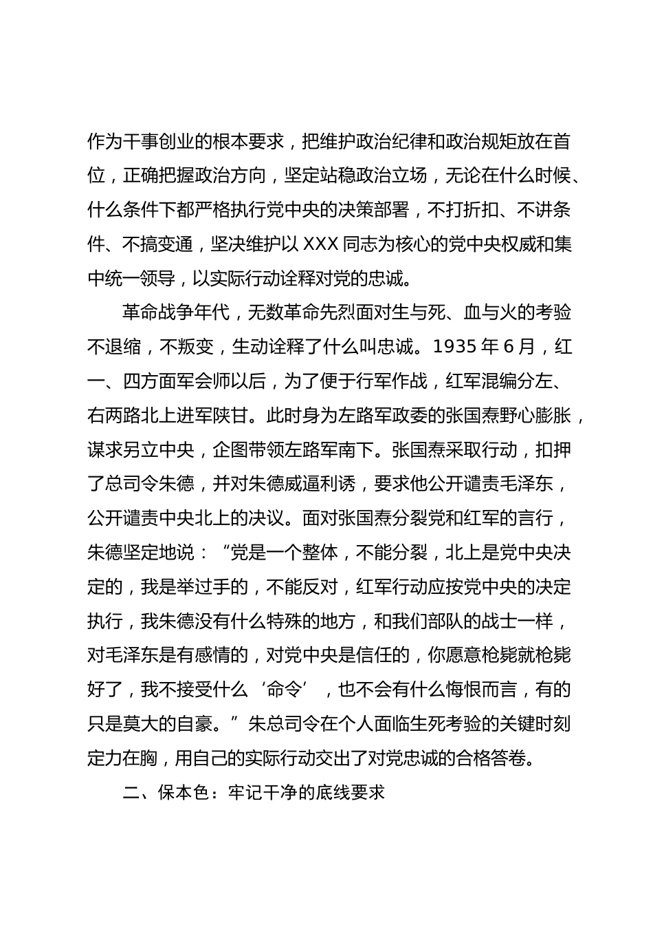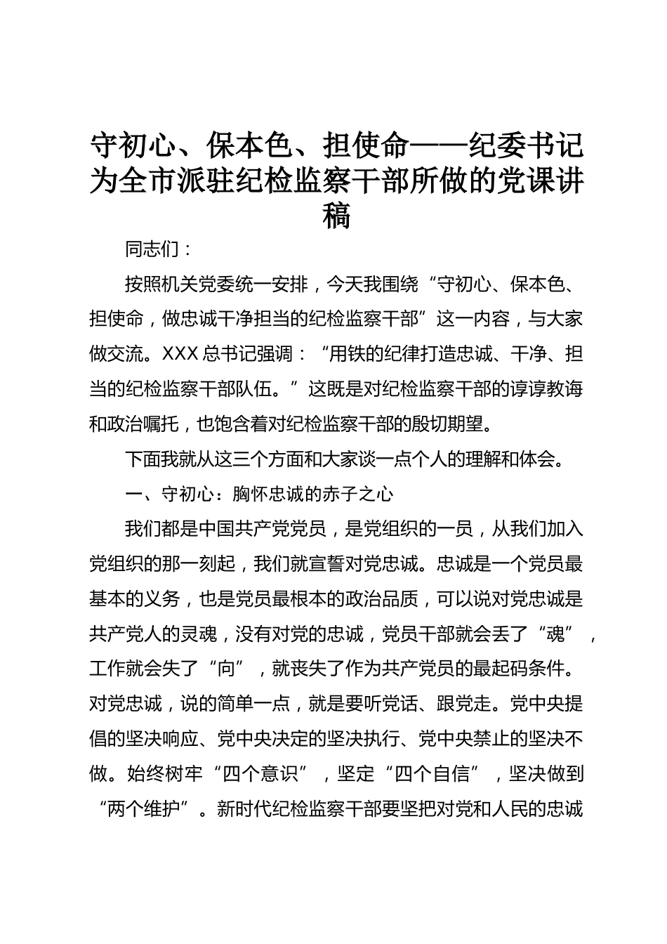 守初心、保本色、擔(dān)使命——紀(jì)委書記為全市派駐紀(jì)檢監(jiān)察干部所做的黨課講稿同志們:按照機(jī)關(guān)黨委統(tǒng)一安排,今天我圍繞“守初心、保本色、擔(dān)使命,做忠誠(chéng)干凈擔(dān)當(dāng)?shù)募o(jì)檢監(jiān)察干部”這一內(nèi)容,與大家做交流。XXX總書記強(qiáng)調(diào):“用鐵的紀(jì)律打造忠誠(chéng)、干凈、擔(dān)當(dāng)?shù)募o(jì)檢監(jiān)察干部隊(duì)伍?!边@既是對(duì)紀(jì)檢監(jiān)察干部的諄諄教誨和政治囑托,也飽含著對(duì)紀(jì)檢監(jiān)察干部的殷切期望。下面我就從這三個(gè)方面和大家談一點(diǎn)個(gè)人的理解和體會(huì)。一、守初心:胸懷忠誠(chéng)的赤子之心我們都是中國(guó)共產(chǎn)黨黨員,是黨組織的一員,從我們加入黨組織的那一刻起,我們就宣誓對(duì)黨忠誠(chéng)。忠誠(chéng)是一個(gè)黨員最基本的義務(wù)...