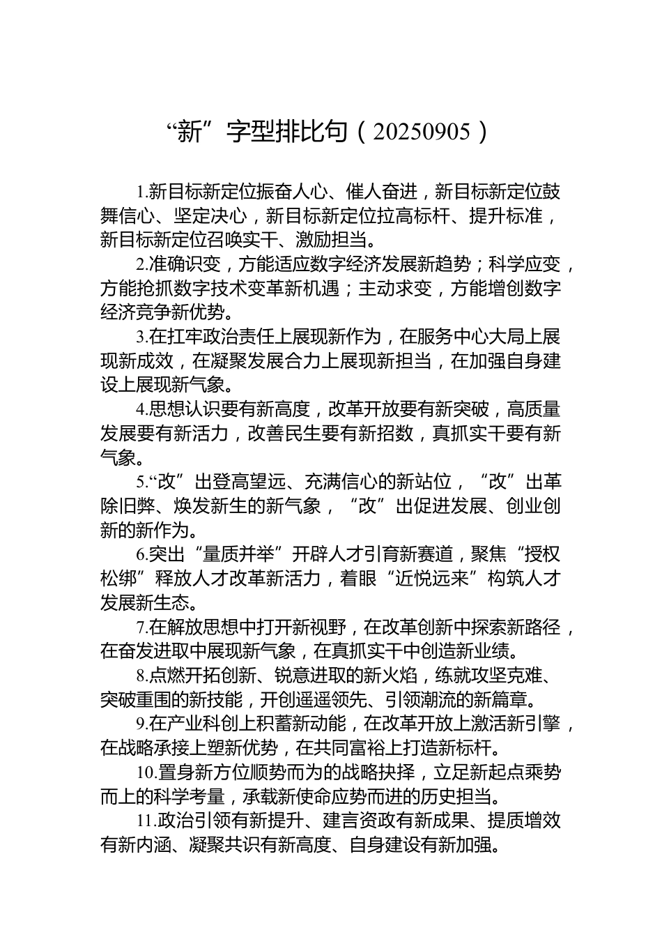“新”字型排比句(20250905)1.新目標(biāo)新定位振奮人心、催人奮進(jìn),新目標(biāo)新定位鼓舞信心、堅(jiān)定決心,新目標(biāo)新定位拉高標(biāo)桿、提升標(biāo)準(zhǔn),新目標(biāo)新定位召喚實(shí)干、激勵(lì)擔(dān)當(dāng)。2.準(zhǔn)確識(shí)變,方能適應(yīng)數(shù)字經(jīng)濟(jì)發(fā)展新趨勢(shì);科學(xué)應(yīng)變,方能搶抓數(shù)字技術(shù)變革新機(jī)遇;主動(dòng)求變,方能增創(chuàng)數(shù)字經(jīng)濟(jì)競(jìng)爭(zhēng)新優(yōu)勢(shì)。3.在扛牢政治責(zé)任上展現(xiàn)新作為,在服務(wù)中心大局上展現(xiàn)新成效,在凝聚發(fā)展合力上展現(xiàn)新?lián)?dāng),在加強(qiáng)自身建設(shè)上展現(xiàn)新氣象。4.思想認(rèn)識(shí)要有新高度,改革開放要有新突破,高質(zhì)量發(fā)展要有新活力,改善民生要有新招數(shù),真抓實(shí)干要有新氣象。5.“改”出登高望遠(yuǎn)、充滿信心的新站位,...