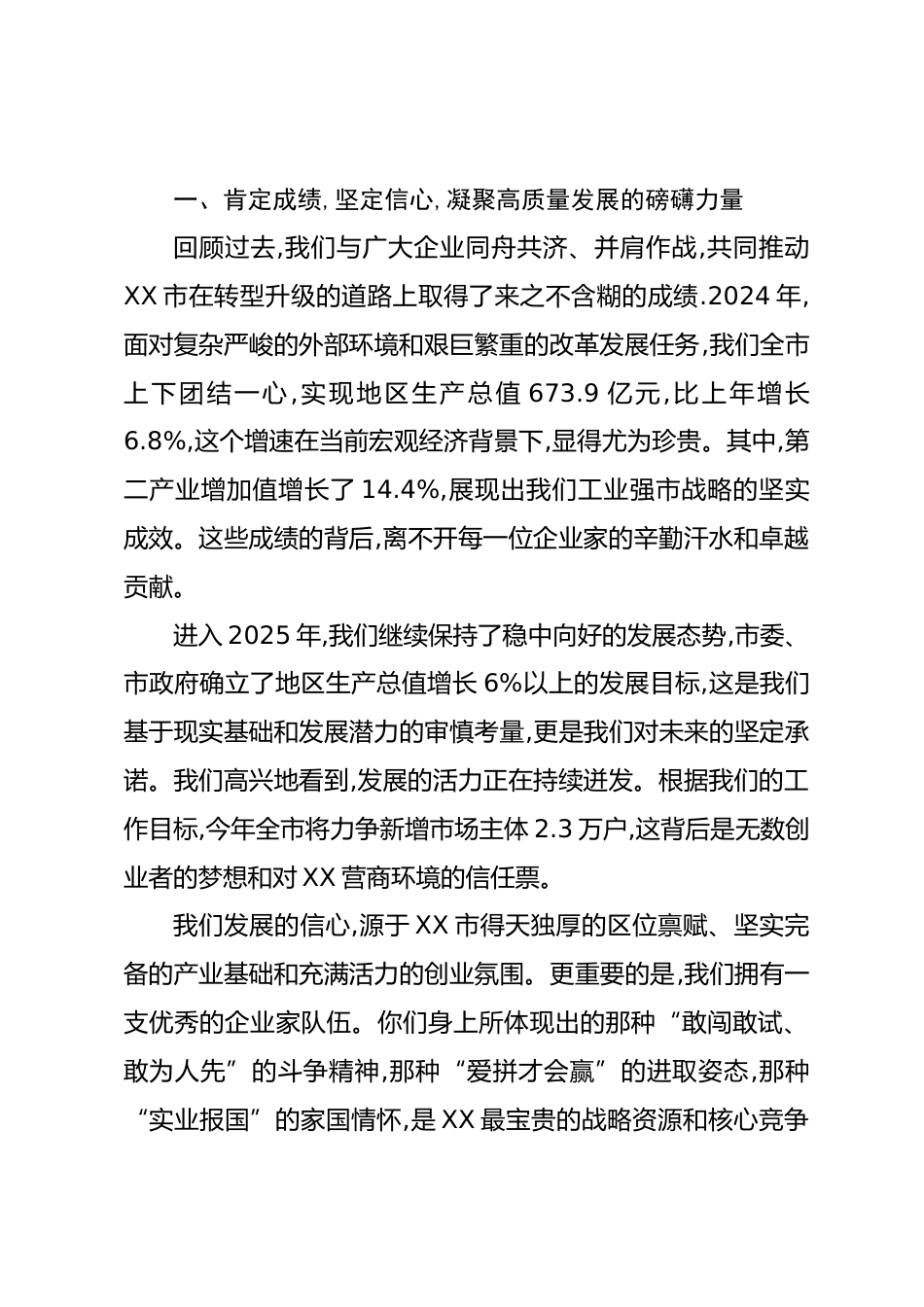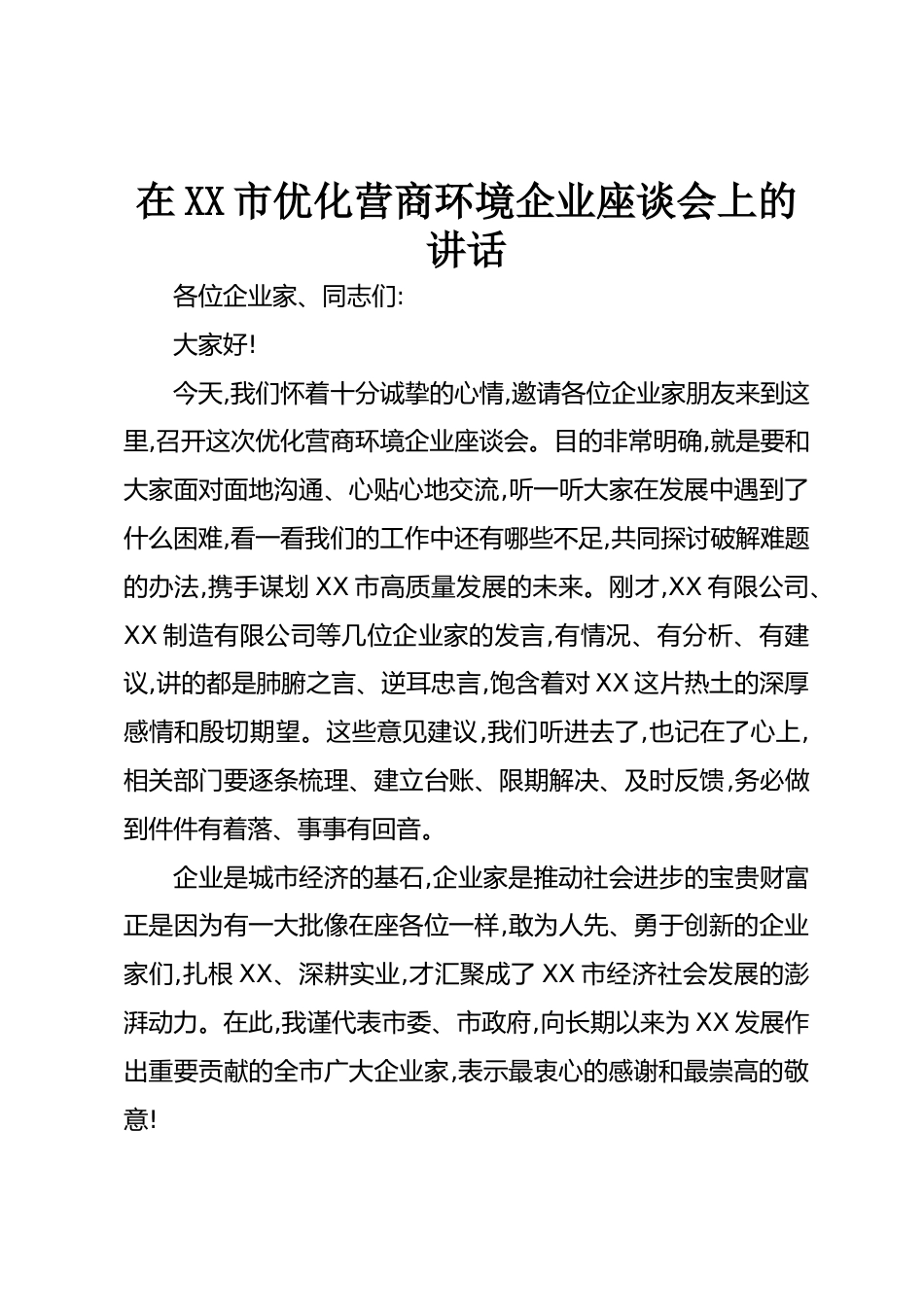 在XX市優(yōu)化營商環(huán)境企業(yè)座談會上的講話各位企業(yè)家、同志們:大家好!今天,我們懷著十分誠摯的心情,邀請各位企業(yè)家朋友來到這里,召開這次優(yōu)化營商環(huán)境企業(yè)座談會。目的非常明確,就是要和大家面對面地溝通、心貼心地交流,聽一聽大家在發(fā)展中遇到了什么困難,看一看我們的工作中還有哪些不足,共同探討破解難題的辦法,攜手謀劃XX市高質(zhì)量發(fā)展的未來。剛才,XX有限公司、XX制造有限公司等幾位企業(yè)家的發(fā)言,有情況、有分析、有建議,講的都是肺腑之言、逆耳忠言,飽含著對XX這片熱土的深厚感情和殷切期望。這些意見建議,我們聽進去了,也記在了心上,相關(guān)部門要逐條梳理、建立臺賬、限...