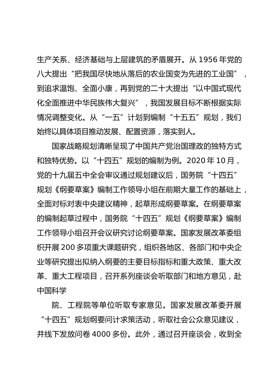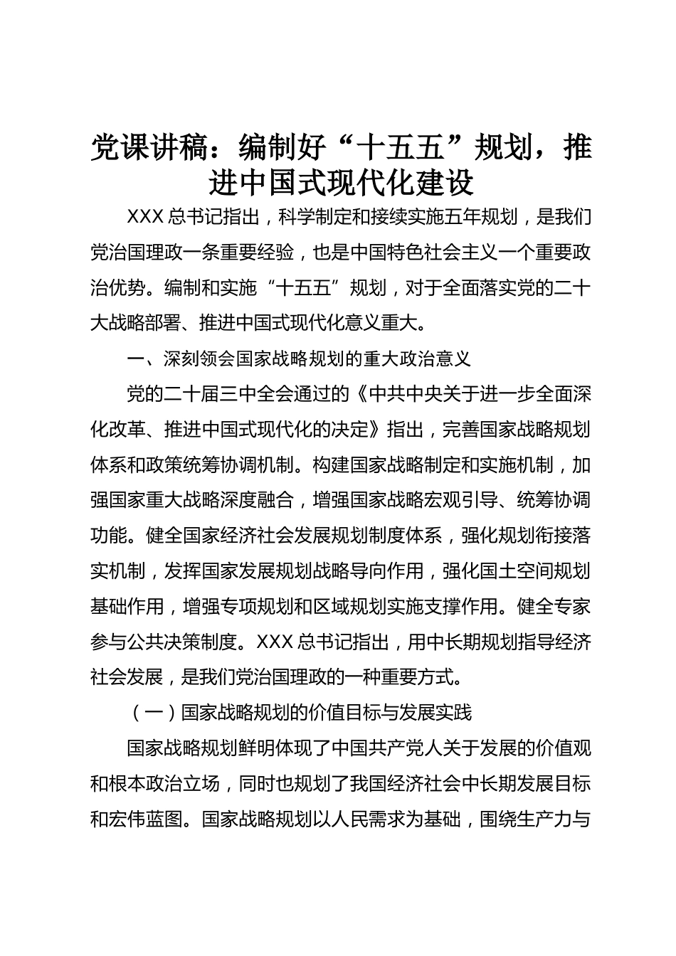 黨課講稿:編制好“十五五”規(guī)劃,推進中國式現(xiàn)代化建設XXX總書記指出,科學制定和接續(xù)實施五年規(guī)劃,是我們黨治國理政一條重要經(jīng)驗,也是中國特色社會主義一個重要政治優(yōu)勢。編制和實施“十五五”規(guī)劃,對于全面落實黨的二十大戰(zhàn)略部署、推進中國式現(xiàn)代化意義重大。一、深刻領(lǐng)會國家戰(zhàn)略規(guī)劃的重大政治意義黨的二十屆三中全會通過的《中共中央關(guān)于進一步全面深化改革、推進中國式現(xiàn)代化的決定》指出,完善國家戰(zhàn)略規(guī)劃體系和政策統(tǒng)籌協(xié)調(diào)機制。構(gòu)建國家戰(zhàn)略制定和實施機制,加強國家重大戰(zhàn)略深度融合,增強國家戰(zhàn)略宏觀引導、統(tǒng)籌協(xié)調(diào)功能。健全國家經(jīng)濟社會發(fā)展規(guī)劃制...
