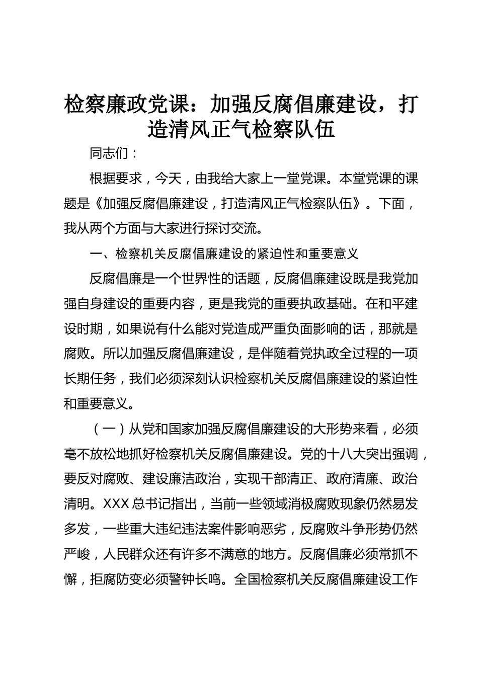 檢察廉政黨課:加強反腐倡廉建設(shè),打造清風(fēng)正氣檢察隊伍同志們:根據(jù)要求,今天,由我給大家上一堂黨課。本堂黨課的課題是《加強反腐倡廉建設(shè),打造清風(fēng)正氣檢察隊伍》。下面,我從兩個方面與大家進行探討交流。一、檢察機關(guān)反腐倡廉建設(shè)的緊迫性和重要意義反腐倡廉是一個世界性的話題,反腐倡廉建設(shè)既是我黨加強自身建設(shè)的重要內(nèi)容,更是我黨的重要執(zhí)政基礎(chǔ)。在和平建設(shè)時期,如果說有什么能對黨造成嚴(yán)重負(fù)面影響的話,那就是腐敗。所以加強反腐倡廉建設(shè),是伴隨著黨執(zhí)政全過程的一項長期任務(wù),我們必須深刻認(rèn)識檢察機關(guān)反腐倡廉建設(shè)的緊迫性和重要意義。(一)從黨和國...