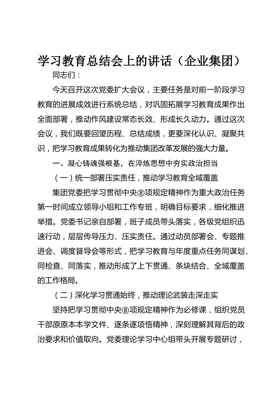 學習教育總結會上的講話(企業(yè)集團)同志們:今天召開這次黨委擴大會議,主要任務是對前一階段學習教育的進展成效進行系統(tǒng)總結,對鞏固拓展學習教育成果作出全面部署,推動作風建設常態(tài)長效、形成長久動力。通過這次會議,我們既要回望歷程、總結成績,更要深化認識、凝聚共識,把學習教育成果轉化為推動集團改革發(fā)展的強大力量。一、凝心鑄魂強根基,在淬煉思想中夯實政治擔當(一)統(tǒng)一部署壓實責任,推動學習教育全域覆蓋集團黨委把學習貫徹中央⑧項規(guī)定精神作為重大政治任務第一時間成立領導小組和工作專班,明確目標要求,細化推進舉措。黨委書記親自部署,班子成員...