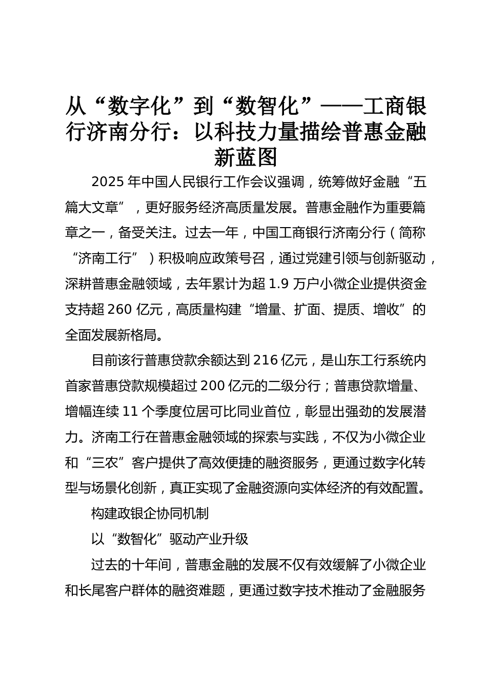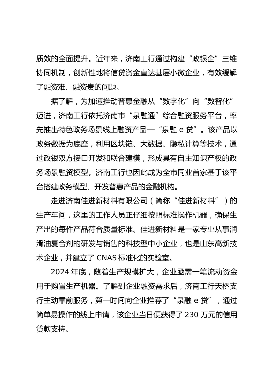 從“數(shù)字化”到“數(shù)智化”——工商銀行濟南分行:以科技力量描繪普惠金融新藍圖2025年中國人民銀行工作會議強調(diào),統(tǒng)籌做好金融“五篇大文章”,更好服務(wù)經(jīng)濟高質(zhì)量發(fā)展。普惠金融作為重要篇章之一,備受關(guān)注。過去一年,中國工商銀行濟南分行(簡稱“濟南工行”)積極響應(yīng)政策號召,通過黨建引領(lǐng)與創(chuàng)新驅(qū)動,深耕普惠金融領(lǐng)域,去年累計為超1.9萬戶小微企業(yè)提供資金支持超260億元,高質(zhì)量構(gòu)建“增量、擴面、提質(zhì)、增收”的全面發(fā)展新格局。目前該行普惠貸款余額達到216億元,是山東工行系統(tǒng)內(nèi)首家普惠貸款規(guī)模超過200億元的二級分行;普惠貸款增量、增幅連續(xù)11個季度位居...