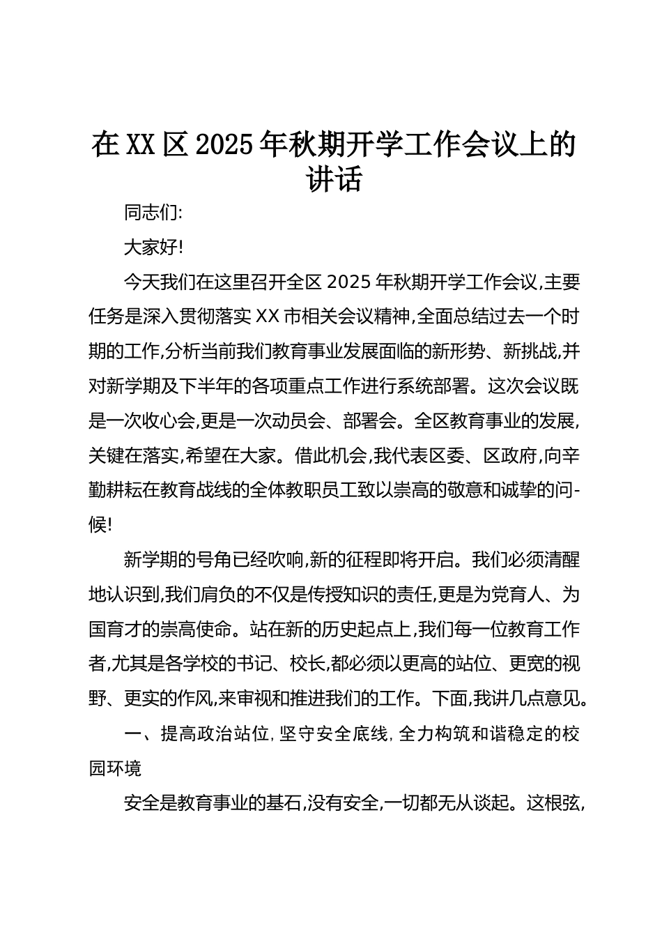 在XX區(qū)2025年秋期開學工作會議上的講話