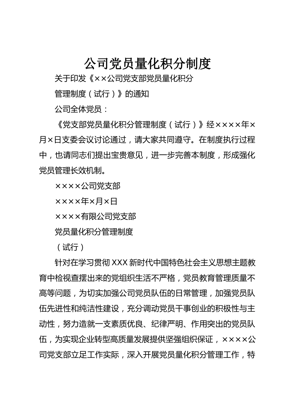公司黨員量化積分制度關(guān)于印發(fā)《××公司黨支部黨員量化積分管理制度(試行)》的通知公司全體黨員:《黨支部黨員量化積分管理制度(試行)》經(jīng)××××年×月×日支委會議討論通過,請大家共同遵守。在制度執(zhí)行過程中,也請同志們提出寶貴意見,進一步完善本制度,形成強化黨員管理長效機制?!痢痢痢凉军h支部××××年×月×日××××有限公司黨支部黨員量化積分管理制度(試行)針對在學(xué)習(xí)貫徹XXX新時代中國特色社會主義思想主題教育中檢視查擺出來的黨組織生活不嚴格,黨員教育管理質(zhì)量不高等問題,為切實加強公司黨員隊伍的日常管理,加強黨員隊伍先進性和純潔...