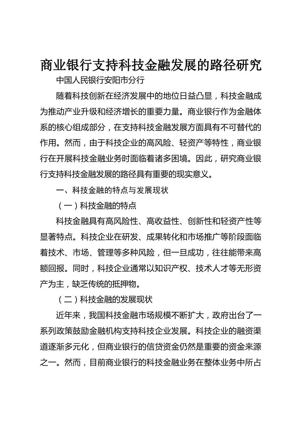 商業(yè)銀行支持科技金融發(fā)展的路徑研究中國人民銀行安陽市分行隨著科技創(chuàng)新在經(jīng)濟(jì)發(fā)展中的地位日益凸顯,科技金融成為推動(dòng)產(chǎn)業(yè)升級(jí)和經(jīng)濟(jì)增長(zhǎng)的重要力量。商業(yè)銀行作為金融體系的核心組成部分,在支持科技金融發(fā)展方面具有不可替代的作用。然而,由于科技企業(yè)的高風(fēng)險(xiǎn)、輕資產(chǎn)等特性,商業(yè)銀行在開展科技金融業(yè)務(wù)時(shí)面臨著諸多困境。因此,研究商業(yè)銀行支持科技金融發(fā)展的路徑具有重要的現(xiàn)實(shí)意義。一、科技金融的特點(diǎn)與發(fā)展現(xiàn)狀(一)科技金融的特點(diǎn)科技金融具有高風(fēng)險(xiǎn)性、高收益性、創(chuàng)新性和輕資產(chǎn)性等顯著特點(diǎn)??萍计髽I(yè)在研發(fā)、成果轉(zhuǎn)化和市場(chǎng)推廣等階段面臨著技術(shù)、市場(chǎng)...
