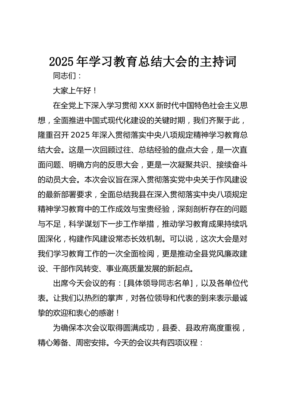 2025年八項(xiàng)規(guī)定學(xué)習(xí)教育總結(jié)大會的主持詞