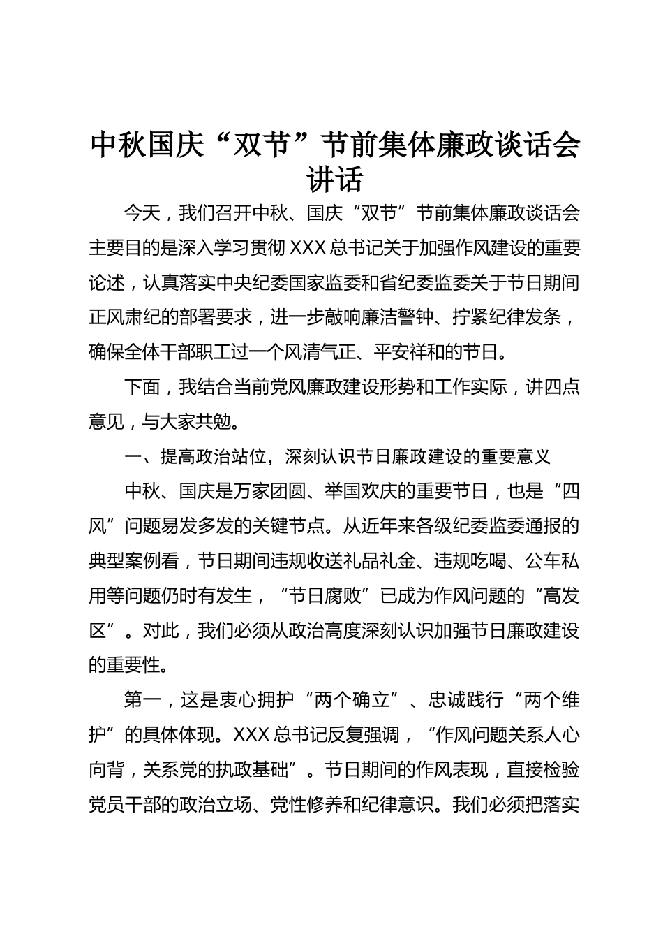 中秋國慶“雙節(jié)”節(jié)前集體廉政談話會(huì)講話今天,我們召開中秋、國慶“雙節(jié)”節(jié)前集體廉政談話會(huì)主要目的是深入學(xué)習(xí)貫徹XXX總書記關(guān)于加強(qiáng)作風(fēng)建設(shè)的重要論述,認(rèn)真落實(shí)中央紀(jì)委國家監(jiān)委和省紀(jì)委監(jiān)委關(guān)于節(jié)日期間正風(fēng)肅紀(jì)的部署要求,進(jìn)一步敲響廉潔警鐘、擰緊紀(jì)律發(fā)條,確保全體干部職工過一個(gè)風(fēng)清氣正、平安祥和的節(jié)日。下面,我結(jié)合當(dāng)前黨風(fēng)廉政建設(shè)形勢(shì)和工作實(shí)際,講四點(diǎn)意見,與大家共勉。一、提高政治站位,深刻認(rèn)識(shí)節(jié)日廉政建設(shè)的重要意義中秋、國慶是萬家團(tuán)圓、舉國歡慶的重要節(jié)日,也是“四風(fēng)”問題易發(fā)多發(fā)的關(guān)鍵節(jié)點(diǎn)。從近年來各級(jí)紀(jì)委監(jiān)委通報(bào)的典型案例看,...