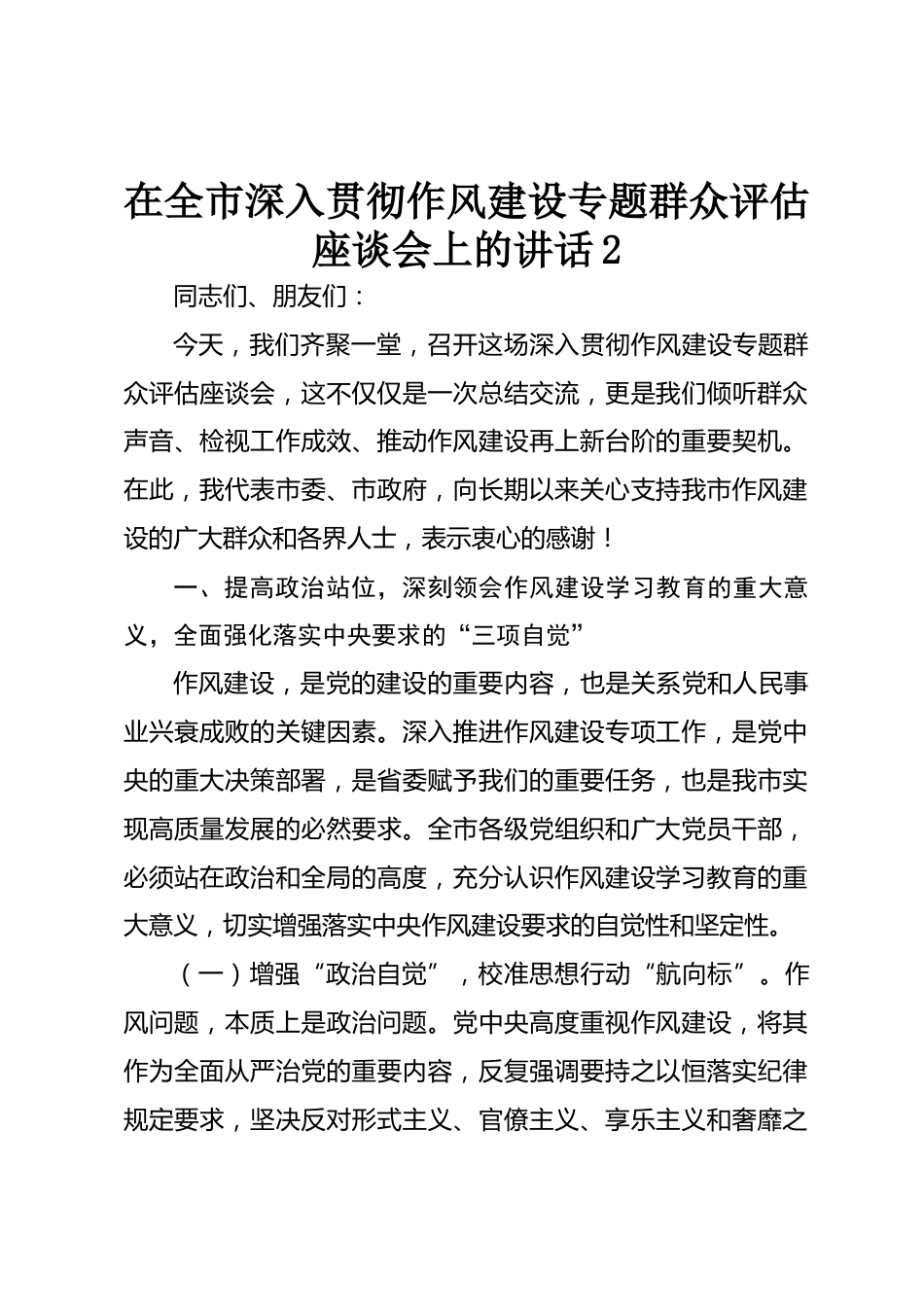 在全市深入貫徹作風(fēng)建設(shè)專題群眾評(píng)估座談會(huì)上的講話2同志們、朋友們:今天,我們齊聚一堂,召開(kāi)這場(chǎng)深入貫徹作風(fēng)建設(shè)專題群眾評(píng)估座談會(huì),這不僅僅是一次總結(jié)交流,更是我們傾聽(tīng)群眾聲音、檢視工作成效、推動(dòng)作風(fēng)建設(shè)再上新臺(tái)階的重要契機(jī)。在此,我代表市委、市政府,向長(zhǎng)期以來(lái)關(guān)心支持我市作風(fēng)建設(shè)的廣大群眾和各界人士,表示衷心的感謝!一、提高政治站位,深刻領(lǐng)會(huì)作風(fēng)建設(shè)學(xué)習(xí)教育的重大意義,全面強(qiáng)化落實(shí)中央要求的“三項(xiàng)自覺(jué)”作風(fēng)建設(shè),是黨的建設(shè)的重要內(nèi)容,也是關(guān)系黨和人民事業(yè)興衰成敗的關(guān)鍵因素。深入推進(jìn)作風(fēng)建設(shè)專項(xiàng)工作,是黨中央的重大決策部署,是...