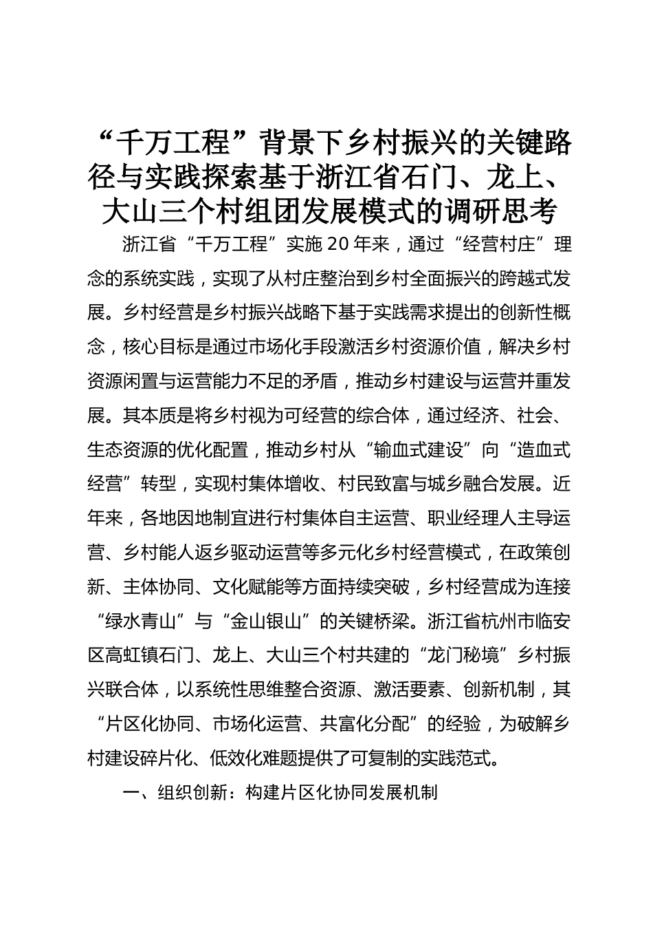 “千萬工程”背景下鄉(xiāng)村振興的關(guān)鍵路徑與實踐探索基于浙江省石門、龍上、大山三個村組團(tuán)發(fā)展模式的調(diào)研思考