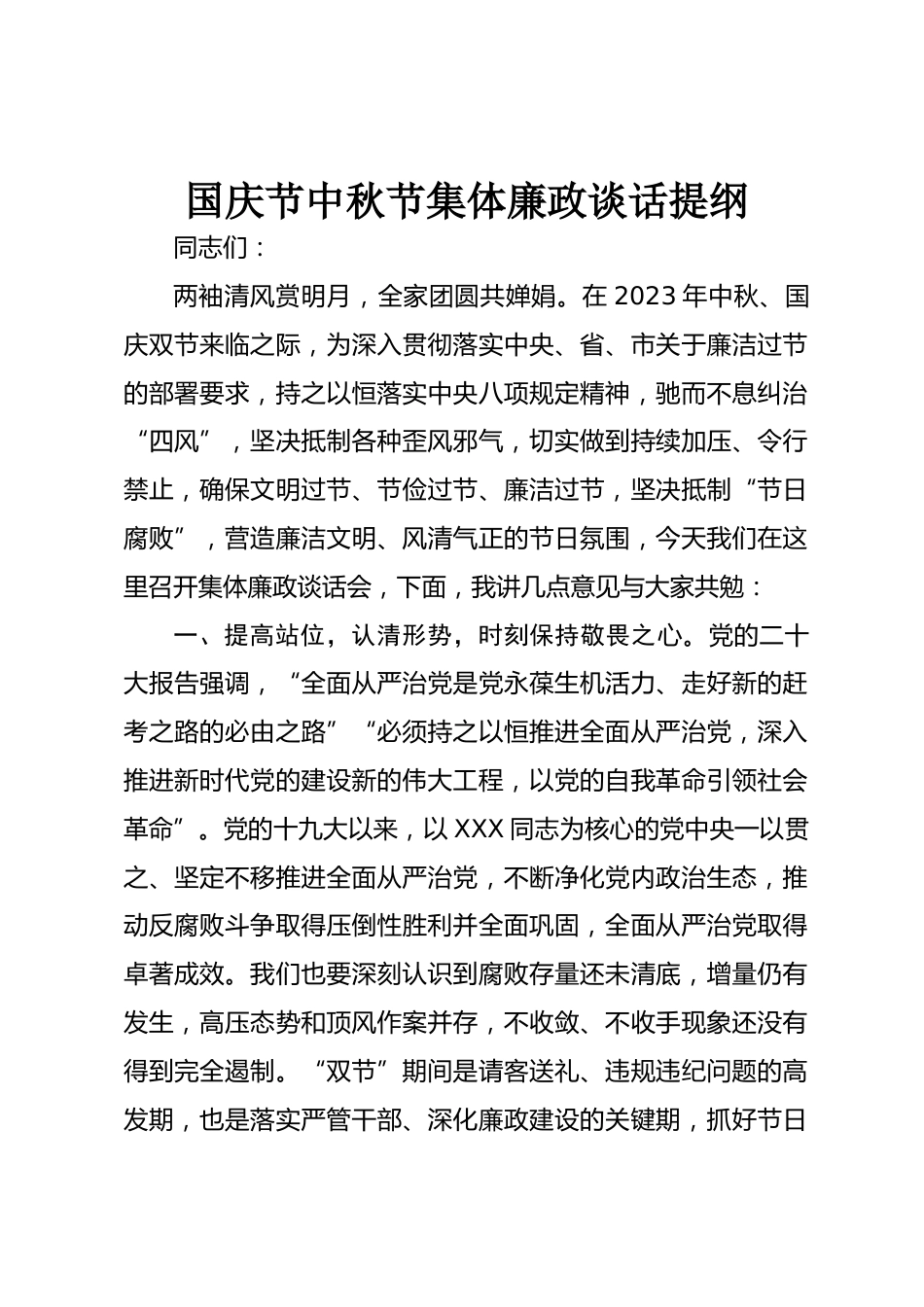國(guó)慶節(jié)中秋節(jié)集體廉政談話(huà)提綱同志們:兩袖清風(fēng)賞明月,全家團(tuán)圓共嬋娟。在2023年中秋、國(guó)慶雙節(jié)來(lái)臨之際,為深入貫徹落實(shí)中央、省、市關(guān)于廉潔過(guò)節(jié)的部署要求,持之以恒落實(shí)中央八項(xiàng)規(guī)定精神,馳而不息糾治“四風(fēng)”,堅(jiān)決抵制各種歪風(fēng)邪氣,切實(shí)做到持續(xù)加壓、令行禁止,確保文明過(guò)節(jié)、節(jié)儉過(guò)節(jié)、廉潔過(guò)節(jié),堅(jiān)決抵制“節(jié)日腐敗”,營(yíng)造廉潔文明、風(fēng)清氣正的節(jié)日氛圍,今天我們?cè)谶@里召開(kāi)集體廉政談話(huà)會(huì),下面,我講幾點(diǎn)意見(jiàn)與大家共勉:一、提高站位,認(rèn)清形勢(shì),時(shí)刻保持敬畏之心。黨的二十大報(bào)告強(qiáng)調(diào),“全面從嚴(yán)治黨是黨永葆生機(jī)活力、走好新的趕考之路的必由之路”“...