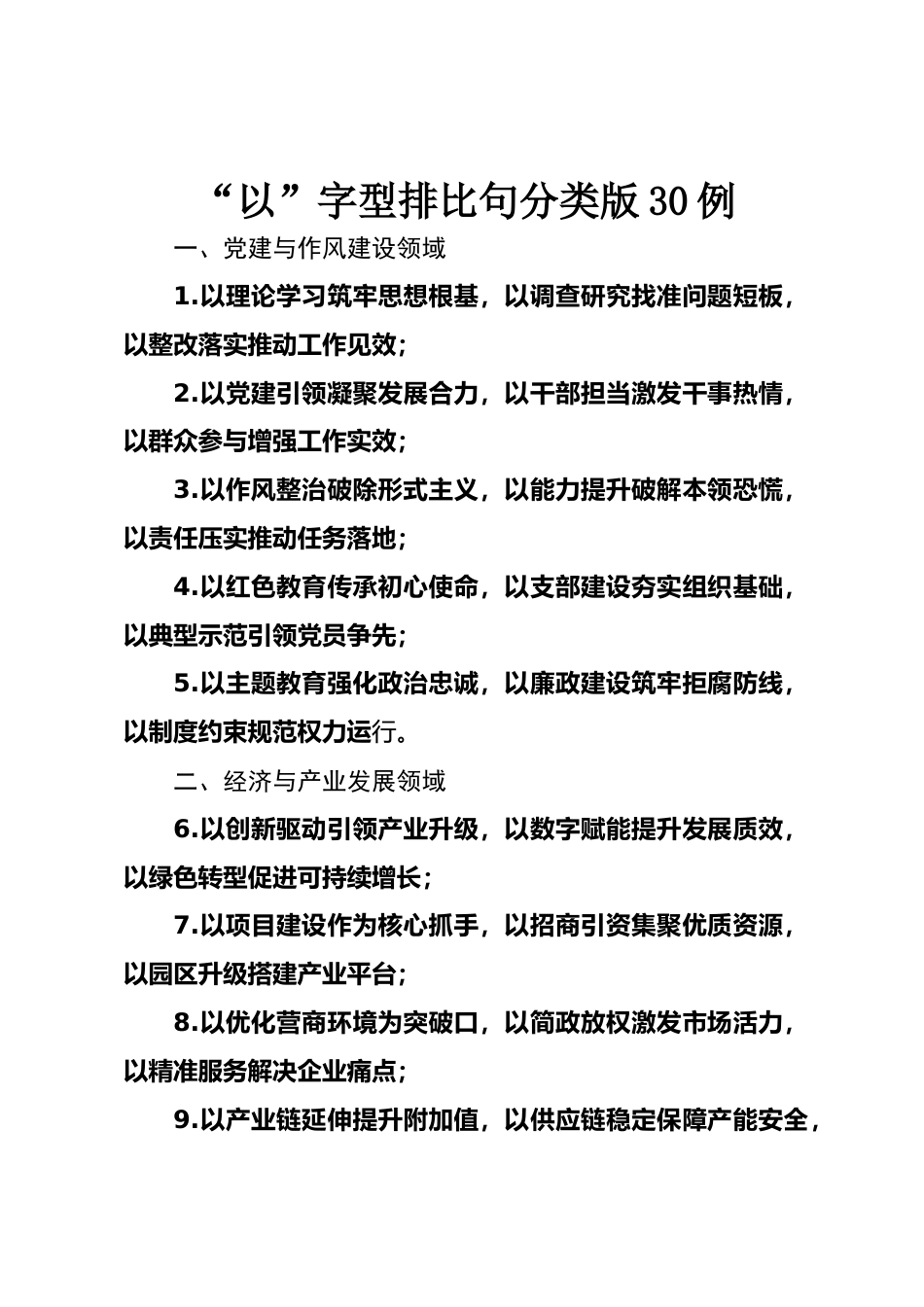 “以”字型排比句分類版30例一、黨建與作風(fēng)建設(shè)領(lǐng)域1.以理論學(xué)習(xí)筑牢思想根基,以調(diào)查研究找準(zhǔn)問題短板,以整改落實(shí)推動工作見效;2.以黨建引領(lǐng)凝聚發(fā)展合力,以干部擔(dān)當(dāng)激發(fā)干事熱情,以群眾參與增強(qiáng)工作實(shí)效;3.以作風(fēng)整治破除形式主義,以能力提升破解本領(lǐng)恐慌,以責(zé)任壓實(shí)推動任務(wù)落地;4.以紅色教育傳承初心使命,以支部建設(shè)夯實(shí)組織基礎(chǔ),以典型示范引領(lǐng)黨員爭先;5.以主題教育強(qiáng)化政治忠誠,以廉政建設(shè)筑牢拒腐防線,以制度約束規(guī)范權(quán)力運(yùn)行。二、經(jīng)濟(jì)與產(chǎn)業(yè)發(fā)展領(lǐng)域6.以創(chuàng)新驅(qū)動引領(lǐng)產(chǎn)業(yè)升級,以數(shù)字賦能提升發(fā)展質(zhì)效,以綠色轉(zhuǎn)型促進(jìn)可持續(xù)增長;7.以項(xiàng)目建設(shè)作...