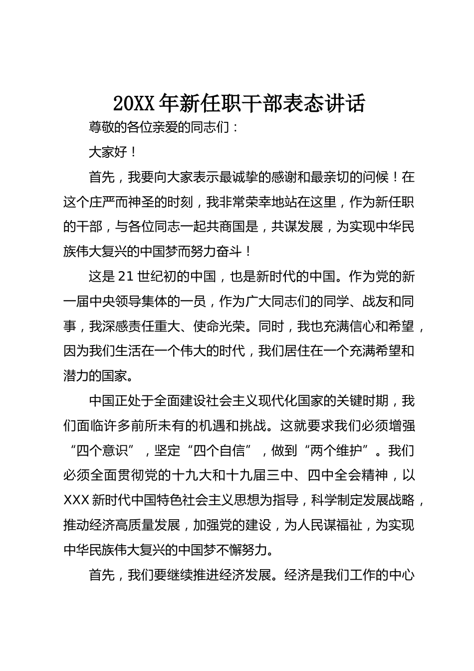 20XX年新任職干部表態(tài)講話尊敬的各位親愛的同志們:大家好!首先,我要向大家表示最誠(chéng)摯的感謝和最親切的問候!在這個(gè)莊嚴(yán)而神圣的時(shí)刻,我非常榮幸地站在這里,作為新任職的干部,與各位同志一起共商國(guó)是,共謀發(fā)展,為實(shí)現(xiàn)中華民族偉大復(fù)興的中國(guó)夢(mèng)而努力奮斗!這是21世紀(jì)初的中國(guó),也是新時(shí)代的中國(guó)。作為黨的新一屆中央領(lǐng)導(dǎo)集體的一員,作為廣大同志們的同學(xué)、戰(zhàn)友和同事,我深感責(zé)任重大、使命光榮。同時(shí),我也充滿信心和希望,因?yàn)槲覀兩钤谝粋€(gè)偉大的時(shí)代,我們居住在一個(gè)充滿希望和潛力的國(guó)家。中國(guó)正處于全面建設(shè)社會(huì)主義現(xiàn)代化國(guó)家的關(guān)鍵時(shí)期,我們面臨許多前...