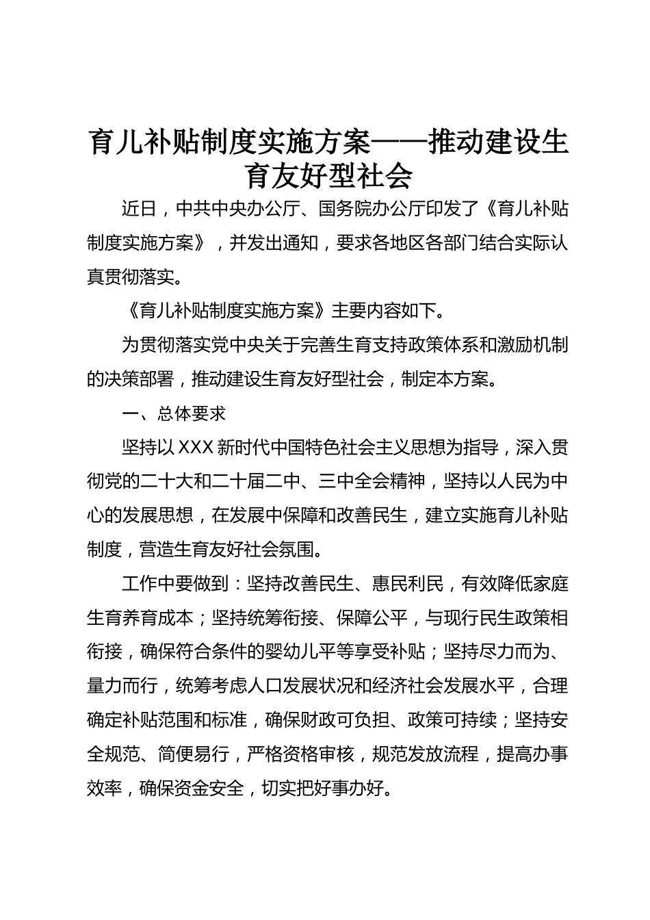 育兒補貼制度實施方案——推動建設生育友好型社會近日,中共中央辦公廳、國務院辦公廳印發(fā)了《育兒補貼制度實施方案》,并發(fā)出通知,要求各地區(qū)各部門結合實際認真貫徹落實?!队齼貉a貼制度實施方案》主要內(nèi)容如下。為貫徹落實黨中央關于完善生育支持政策體系和激勵機制的決策部署,推動建設生育友好型社會,制定本方案。一、總體要求堅持以XXX新時代中國特色社會主義思想為指導,深入貫徹黨的二十大和二十屆二中、三中全會精神,堅持以人民為中心的發(fā)展思想,在發(fā)展中保障和改善民生,建立實施育兒補貼制度,營造生育友好社會氛圍。工作中要做到:堅持改善民生、惠民利...