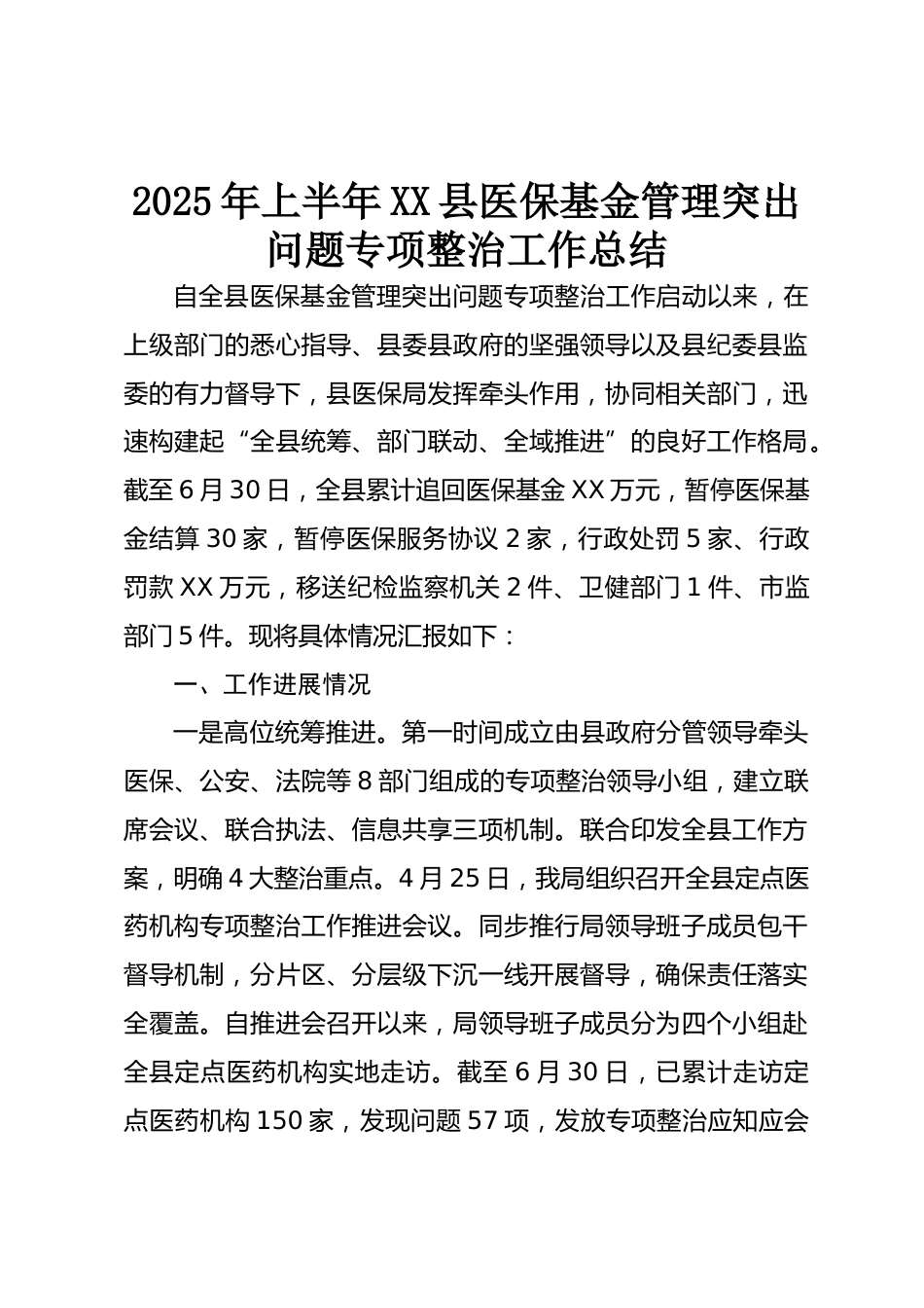 2025年上半年XX縣醫(yī)?;鸸芾硗怀鰡栴}專項整治工作總結(jié)自全縣醫(yī)?;鸸芾硗怀鰡栴}專項整治工作啟動以來,在上級部門的悉心指導(dǎo)、縣委縣政府的堅強領(lǐng)導(dǎo)以及縣紀(jì)委縣監(jiān)委的有力督導(dǎo)下,縣醫(yī)保局發(fā)揮牽頭作用,協(xié)同相關(guān)部門,迅速構(gòu)建起“全縣統(tǒng)籌、部門聯(lián)動、全域推進(jìn)”的良好工作格局。截至6月30日,全縣累計追回醫(yī)?;餢X萬元,暫停醫(yī)?;鸾Y(jié)算30家,暫停醫(yī)保服務(wù)協(xié)議2家,行政處罰5家、行政罰款XX萬元,移送紀(jì)檢監(jiān)察機(jī)關(guān)2件、衛(wèi)健部門1件、市監(jiān)部門5件?,F(xiàn)將具體情況匯報如下:一、工作進(jìn)展情況一是高位統(tǒng)籌推進(jìn)。第一時間成立由縣政府分管領(lǐng)導(dǎo)牽頭醫(yī)保、公安、法院...