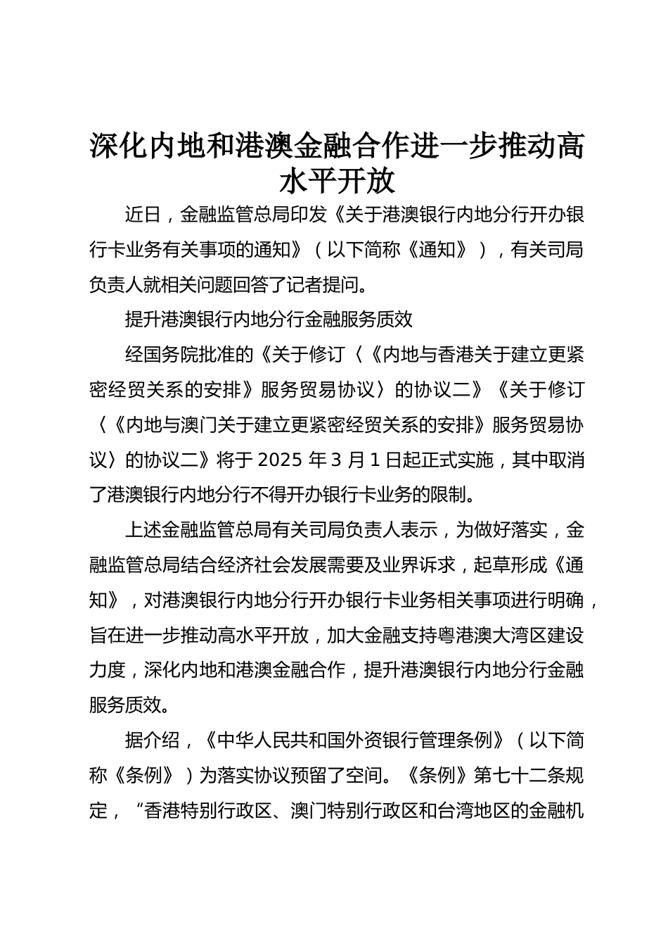 深化內(nèi)地和港澳金融合作進(jìn)一步推動高水平開放近日,金融監(jiān)管總局印發(fā)《關(guān)于港澳銀行內(nèi)地分行開辦銀行卡業(yè)務(wù)有關(guān)事項的通知》(以下簡稱《通知》),有關(guān)司局負(fù)責(zé)人就相關(guān)問題回答了記者提問。提升港澳銀行內(nèi)地分行金融服務(wù)質(zhì)效經(jīng)國務(wù)院批準(zhǔn)的《關(guān)于修訂〈《內(nèi)地與香港關(guān)于建立更緊密經(jīng)貿(mào)關(guān)系的安排》服務(wù)貿(mào)易協(xié)議〉的協(xié)議二》《關(guān)于修訂〈《內(nèi)地與澳門關(guān)于建立更緊密經(jīng)貿(mào)關(guān)系的安排》服務(wù)貿(mào)易協(xié)議〉的協(xié)議二》將于2025年3月1日起正式實施,其中取消了港澳銀行內(nèi)地分行不得開辦銀行卡業(yè)務(wù)的限制。上述金融監(jiān)管總局有關(guān)司局負(fù)責(zé)人表示,為做好落實,金融監(jiān)管總局結(jié)合經(jīng)濟(jì)社...