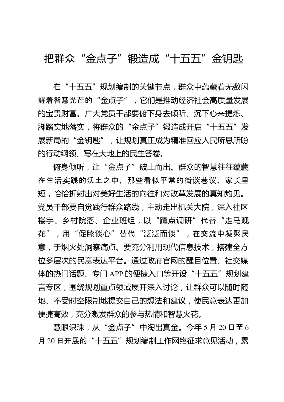 把群眾“金點(diǎn)子”鍛造成“十五五”金鑰匙在“十五五”規(guī)劃編制的關(guān)鍵節(jié)點(diǎn),群眾中蘊(yùn)藏著無(wú)數(shù)閃耀著智慧光芒的“金點(diǎn)子”,它們是推動(dòng)經(jīng)濟(jì)社會(huì)高質(zhì)量發(fā)展的寶貴財(cái)富。廣大黨員干部要俯下身去傾聽(tīng)、沉下心來(lái)提煉、腳踏實(shí)地落實(shí),將群眾的“金點(diǎn)子”鍛造成開啟“十五五”發(fā)展新局的“金鑰匙”,讓規(guī)劃真正成為精準(zhǔn)回應(yīng)人民所思所盼的行動(dòng)綱領(lǐng)、寫在大地上的民生答卷。俯身傾聽(tīng),讓“金點(diǎn)子”破土而出。群眾的智慧往往蘊(yùn)藏在生活踐的沃土之中,那些看似平常的街巷、家里實(shí)談議長(zhǎng)短,恰恰折射出對(duì)美好生活的向往和對(duì)改革發(fā)展的真知灼見(jiàn)。黨員干部要自覺(jué)踐行群眾路線,主動(dòng)走出...