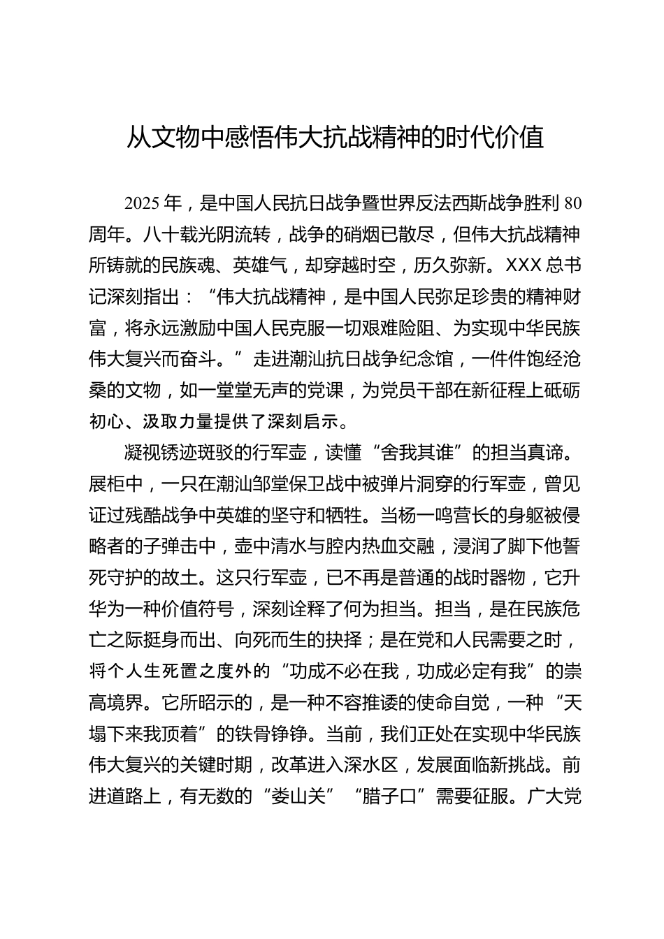 從文物中感悟偉大抗戰(zhàn)精神的時(shí)代價(jià)值2025年,是中國(guó)人民抗日戰(zhàn)爭(zhēng)暨世界反法西斯戰(zhàn)爭(zhēng)勝利80周年。八十載光陰流轉(zhuǎn),戰(zhàn)爭(zhēng)的硝煙已散盡,但偉大抗戰(zhàn)精神所鑄就的民族魂、英雄氣,卻穿越時(shí)空,歷久彌新。XXX總書(shū)記深刻指出:“偉大抗戰(zhàn)精神,是中國(guó)人民彌足珍貴的精神財(cái)富,將永遠(yuǎn)激勵(lì)中國(guó)人民克服一切艱難險(xiǎn)阻、為實(shí)現(xiàn)中華民族偉大復(fù)興而奮斗?!弊哌M(jìn)潮汕抗日戰(zhàn)爭(zhēng)紀(jì)念館,一件件飽經(jīng)滄桑的文物,如一堂堂無(wú)聲的黨課,為黨員干部在新征程上砥礪初心、汲取力量提供了深刻啟示。凝視銹跡斑駁的行軍壺,讀懂“舍我其誰(shuí)”的擔(dān)當(dāng)真諦。展柜中,一只在潮汕鄒堂保衛(wèi)戰(zhàn)中被彈片洞穿的...