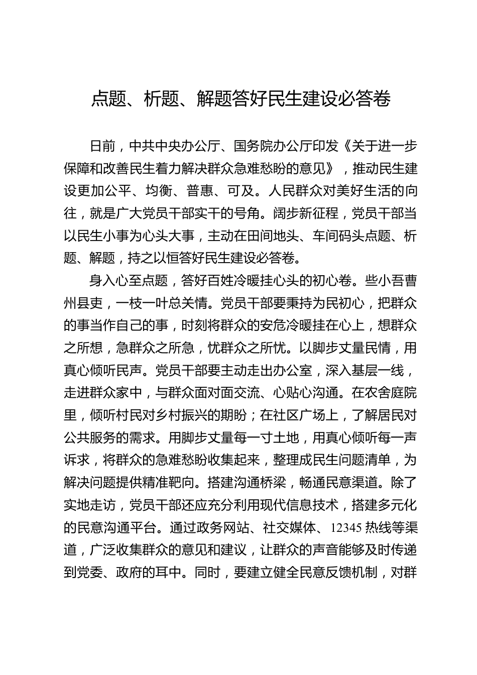 點(diǎn)題、析題、解題答好民生建設(shè)必答卷日前,中共中央辦公廳、國(guó)務(wù)院辦公廳印發(fā)《關(guān)于進(jìn)一步保障和改善民生著力解決群眾急難愁盼的意見》,推動(dòng)民生建設(shè)更加公平、均衡、普惠、可及。人民群眾對(duì)美好生活的向往,就是廣大黨員干部實(shí)干的號(hào)角。闊步新征程,黨員干部當(dāng)以民生小事為心頭大事,主動(dòng)在田間地頭、車間碼頭點(diǎn)題、析題、解題,持之以恒答好民生建設(shè)必答卷。身入心至點(diǎn)題,答好百姓冷暖掛心頭的初心卷。些小吾曹州縣吏,一枝一葉總關(guān)情。黨員干部要秉持為民初心,把群眾的事當(dāng)作自己的事,時(shí)刻將群眾的安危冷暖掛在心上,想群眾之所想,急群眾之所急,憂群眾之所憂。...