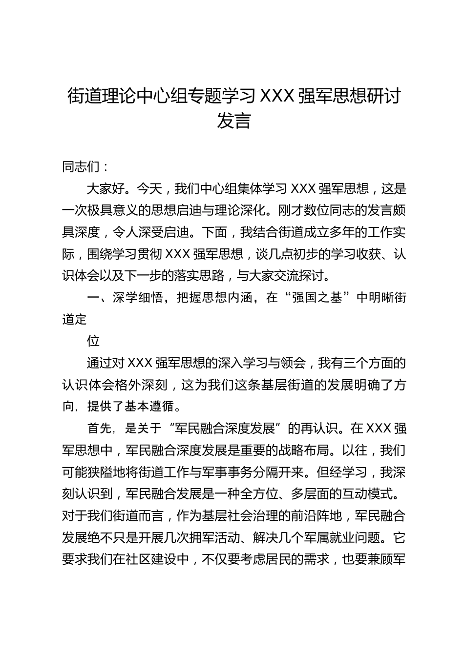 街道理論中心組專題學(xué)習(xí)XXX強(qiáng)軍思想研討發(fā)言同志們:大家好。今天,我們中心組集體學(xué)習(xí)XXX強(qiáng)軍思想,這是一次極具意義的思想啟迪與理論深化。剛才數(shù)位同志的發(fā)言頗具深度,令人深受啟迪。下面,我結(jié)合街道成立多年的工作實際,圍繞學(xué)習(xí)貫徹XXX強(qiáng)軍思想,談幾點初步的學(xué)習(xí)收獲、認(rèn)識體會以及下一步的落實思路,與大家交流探討。一、深學(xué)細(xì)悟,把握思想內(nèi)涵,在“強(qiáng)國之基”中明晰街道定位通過對XXX強(qiáng)軍思想的深入學(xué)習(xí)與領(lǐng)會,我有三個方面的認(rèn)識體會格外深刻,這為我們這條基層街道的發(fā)展明確了方向,提供了基本遵循。首先,是關(guān)于“軍民融合深度發(fā)展”的再認(rèn)識。在XXX強(qiáng)...