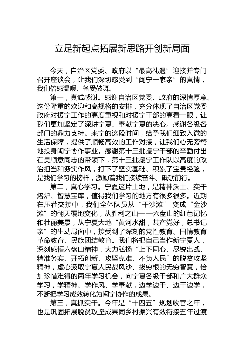 福建省援寧掛職干部在座談會上的發(fā)言材料匯編(6篇)目錄1.立足新起點拓展新思路開創(chuàng)新局面22.閩寧的故事因每一位奮斗者而更加精彩................43.閩寧協(xié)作的接力棒我們會穩(wěn)穩(wěn)傳下去...................74.西海固人民“旱塬播綠”的堅韌永遠激勵我們前行.95.一次寧夏行終生閩寧情....................................126.做好閩寧兩地的“聯(lián)絡(luò)員”“服務(wù)員”和“宣傳員”.............................................................................15立足新起點拓展新思路開創(chuàng)新局面今天,自治區(qū)黨委、政府以“最高禮遇”迎接并專門召開座談會,讓我們深切感受...
